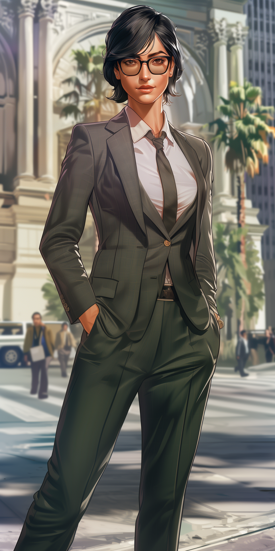 The image showcases a fair-skinned woman in her twenties with a striking blunt bob hairstyle and square glasses. She is dressed in an unbuttoned suit jacket over a vest and tie, set against a backdrop of City Hall, capturing a unique urban vibe.