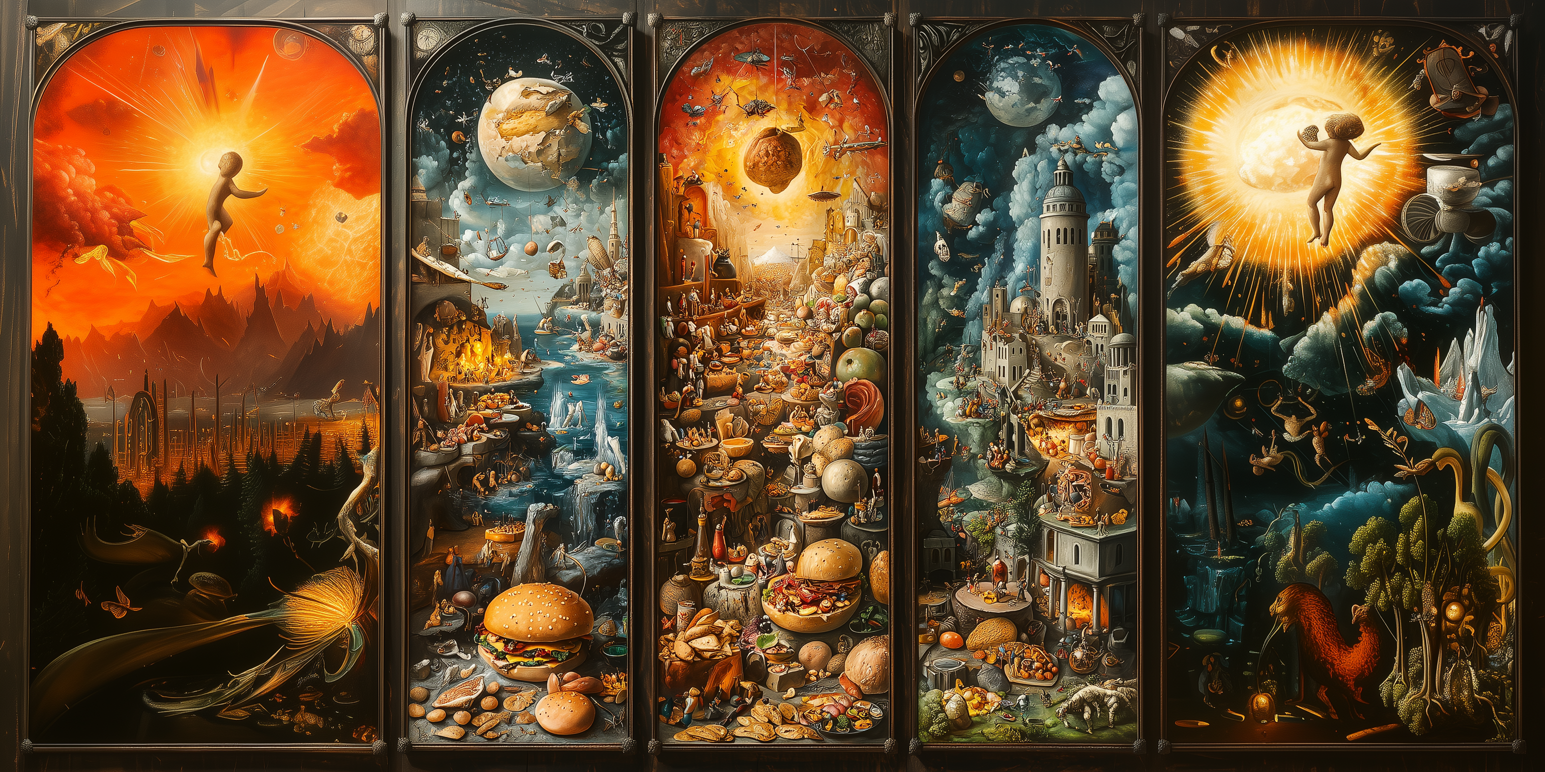 The image features a surreal triptych that captures chaotic urban environments, strange hybrid creatures, and a dystopian atmosphere. Intricate details and fantastical elements create a vivid and thought-provoking reflection of modern life.