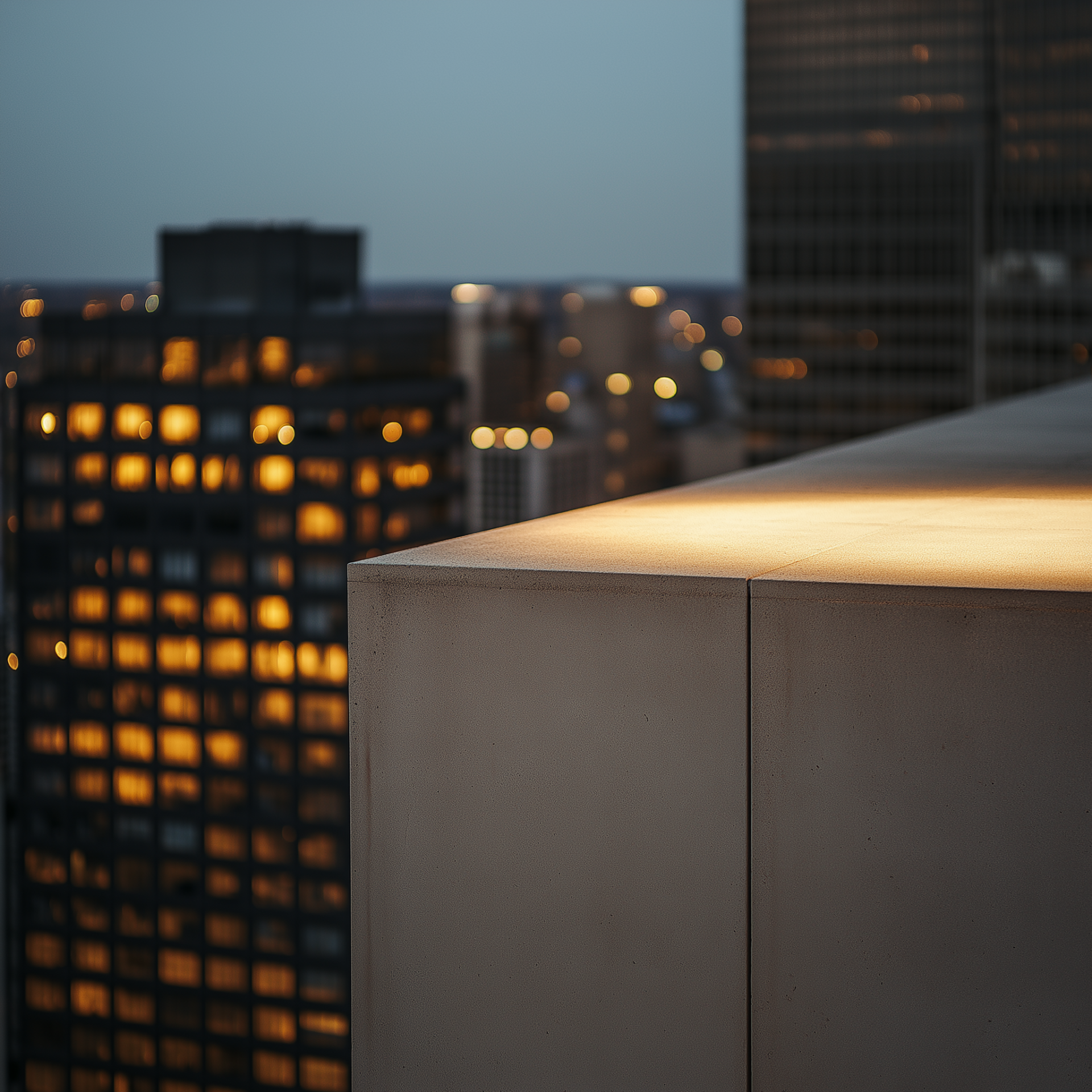 The image showcases a close-up side view of a beige concrete block illuminated by soft light. In the background, a vibrant night metropolis creates a stunning contrast against the serene foreground.