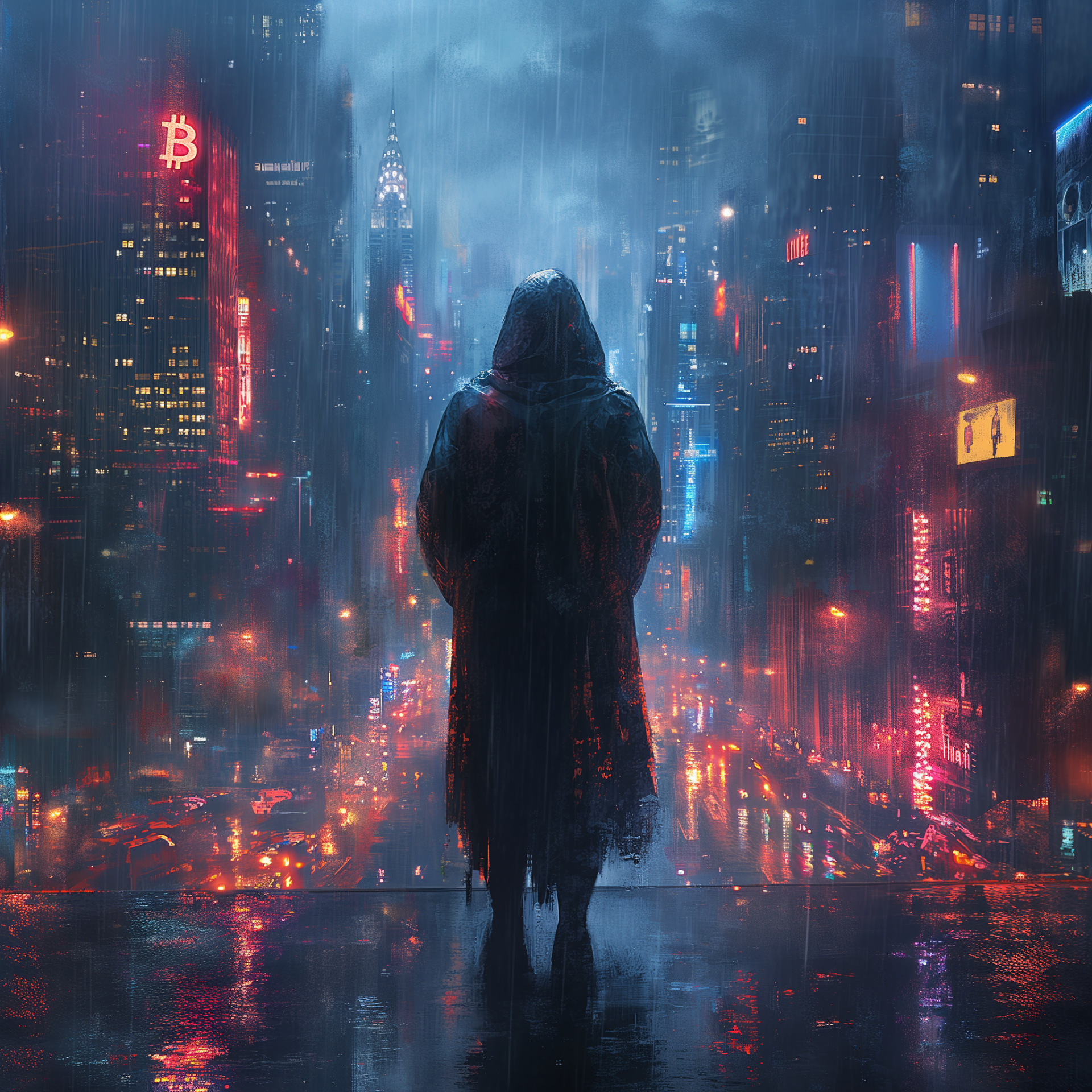 A solitary hooded figure gazes out over a vibrant futuristic city, where the brilliance of neon lights dances upon the surface of rain-soaked streets. The scene captures a sense of mystery and intrigue, enveloping the viewer in a captivating, atmospheric moment.