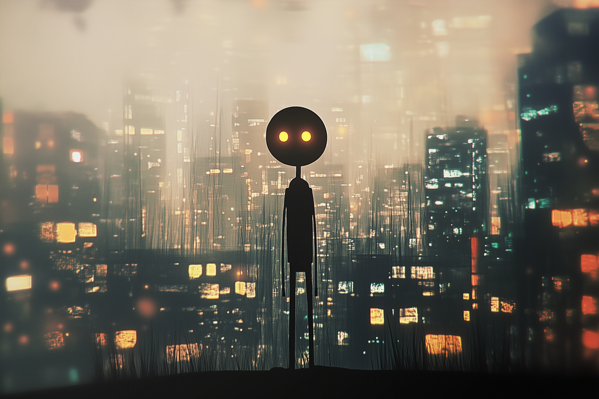 A simplistic stickman figure gazes at the vibrant flashing lights of a city skyline at night. The image conveys a sense of wonder and adventure in an urban environment.