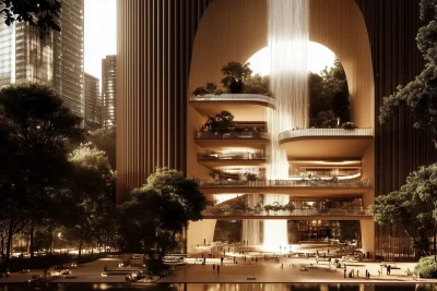 The image depicts a large, sprawling colony characterized by sleek, modern architecture and vibrant, colorful structures. An atmosphere of innovation and progress fills the scene as futuristic designs blend with the landscape.