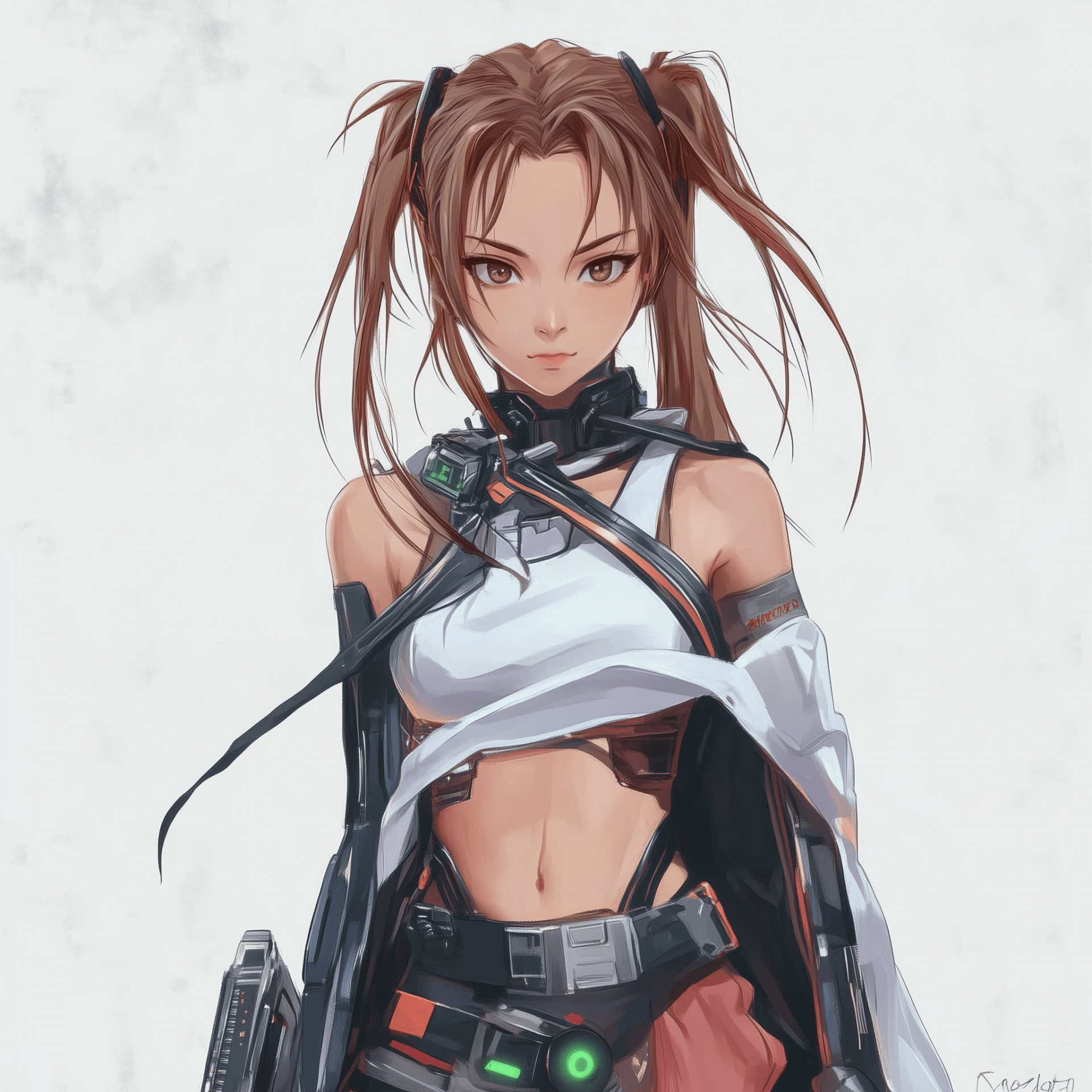 The image features a realistic woman dressed in punk cybernetic attire, reminiscent of a futuristic character. She stands confidently in street wear that blends edgy aesthetics with high-tech elements.