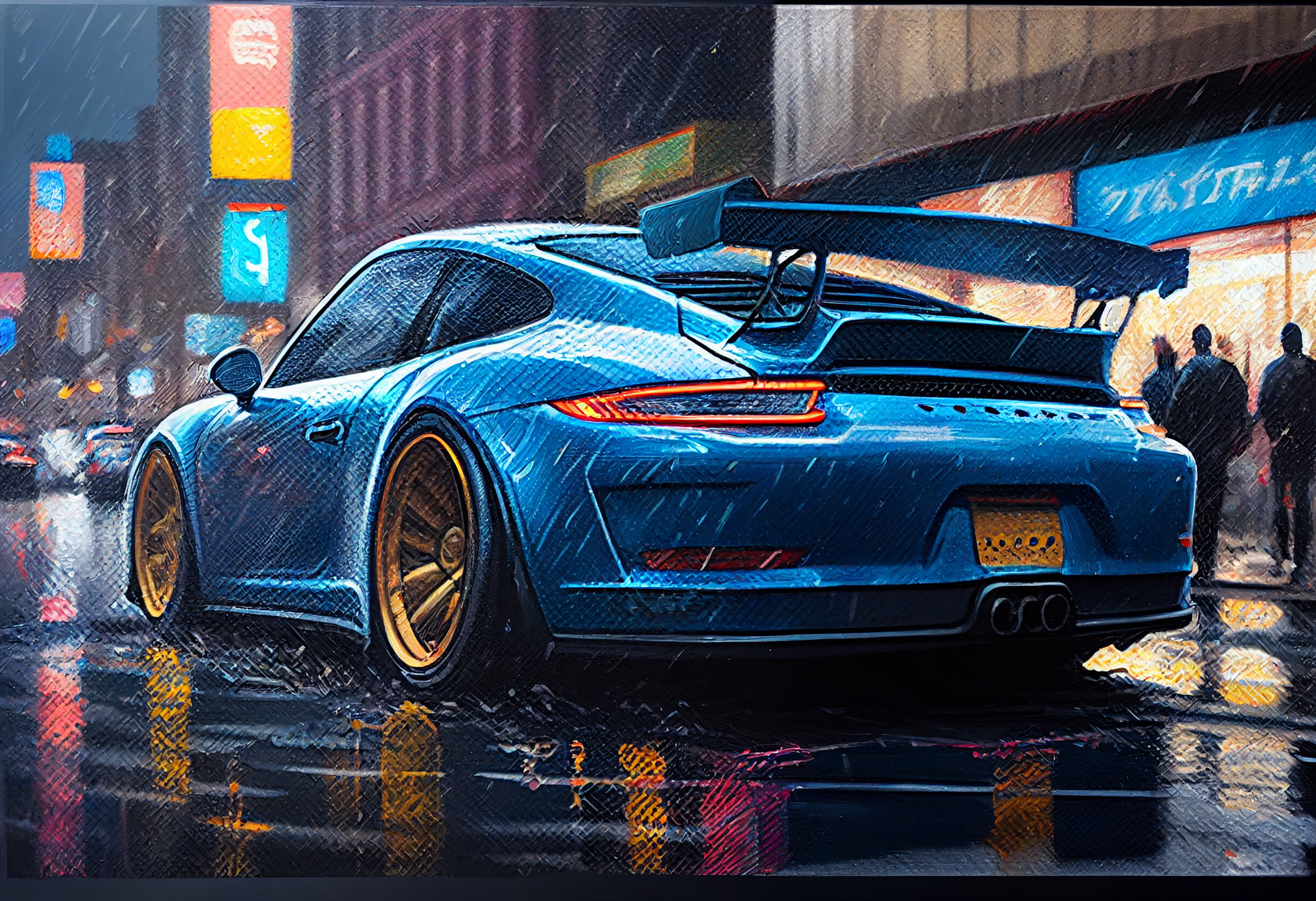 Blue sports car on a rainy city street, highlighted by urban lights and bustling pedestrians, portrayed in a painterly style.
