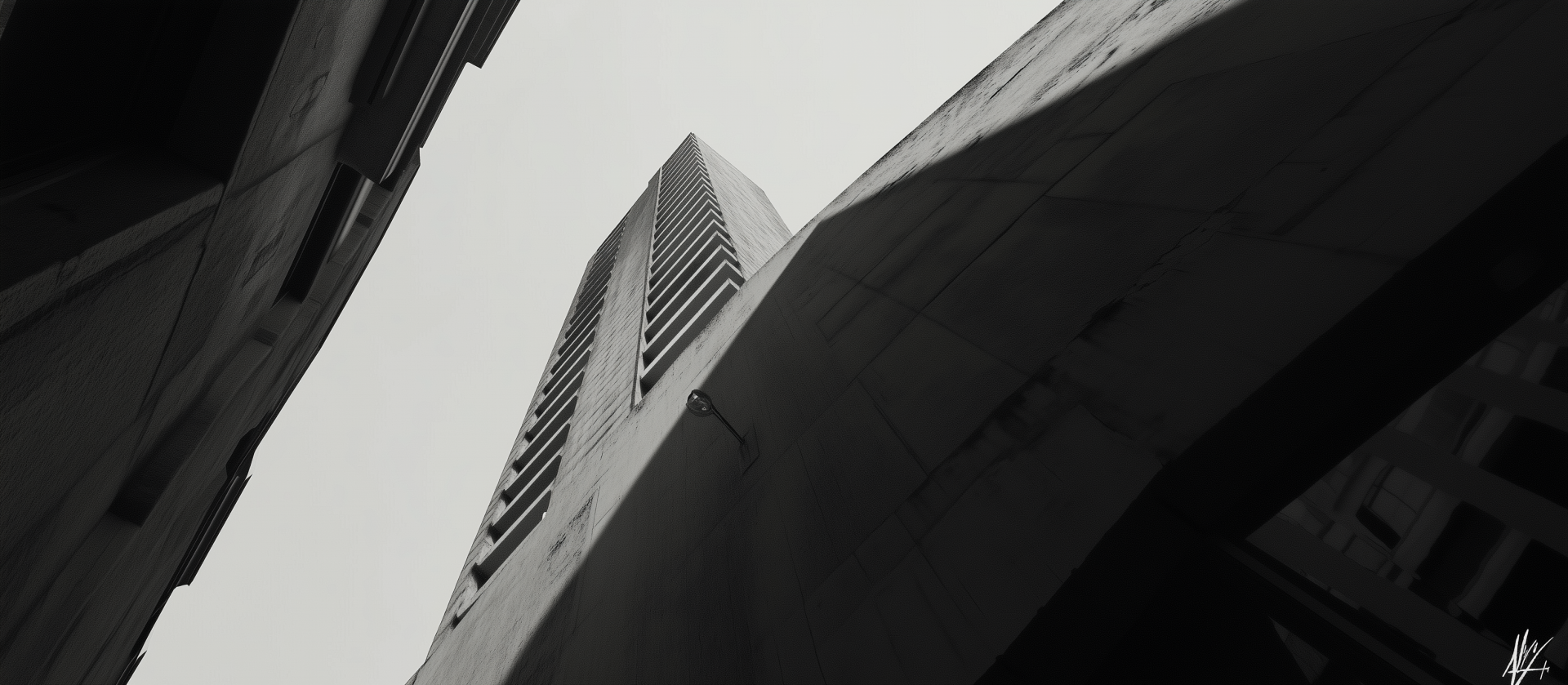 This photorealistic image captures a modernist office tower from the 1960s, seen from the ground level looking upward. The stark black and white contrast creates a bleak and cinematic atmosphere, emphasizing the structure's bold lines and geometric forms.