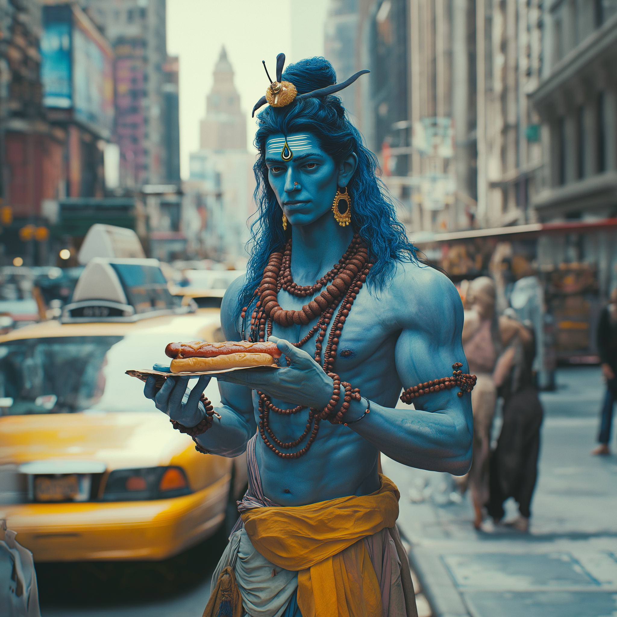 The image showcases a hyperrealistic depiction of the Hindu god Shiva against the backdrop of a bustling New York City street. His vibrant blue skin and multiple arms contrast with the urban environment, creating a unique blend of divine presence and everyday life.