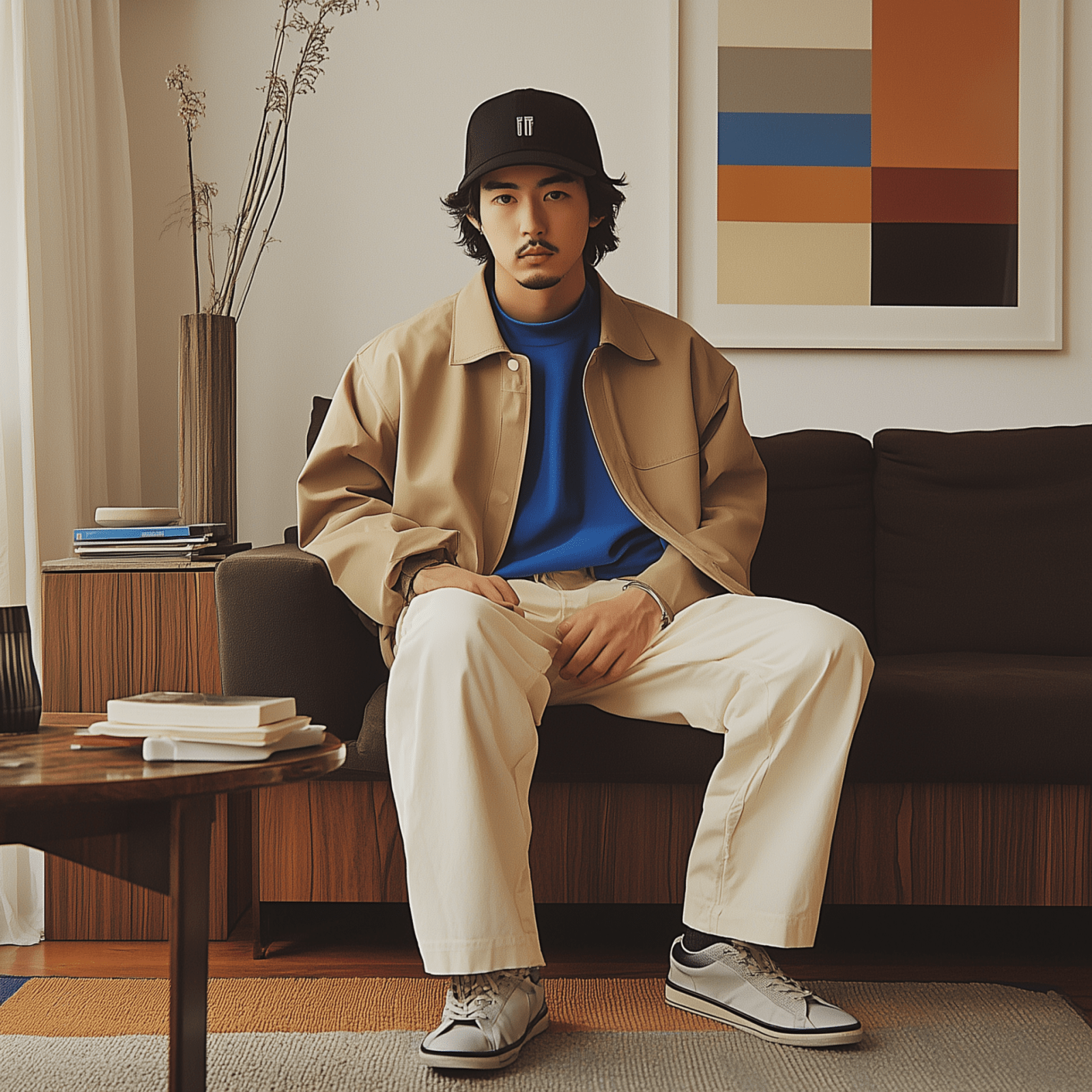 The image features a man in a stylish living room, showcasing the blend of comfort and elegance in streetwear fashion. His relaxed pose and modern attire reflect a contemporary aesthetic that captures the essence of Japanese style.