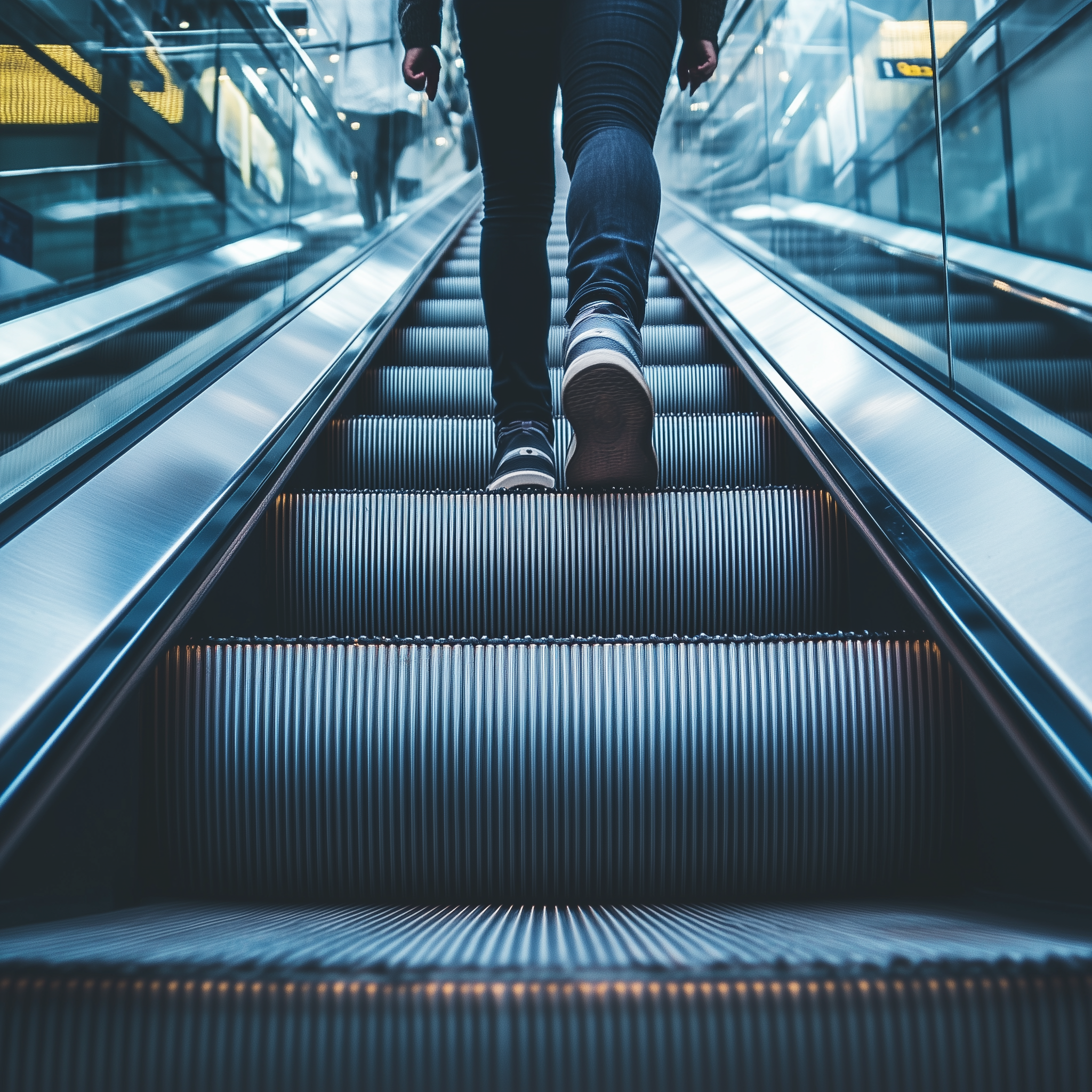 A view from below showing the three bottom steps of an escalator, as if someone is walking up the stairs. The steps are metal with yellow caution markings.