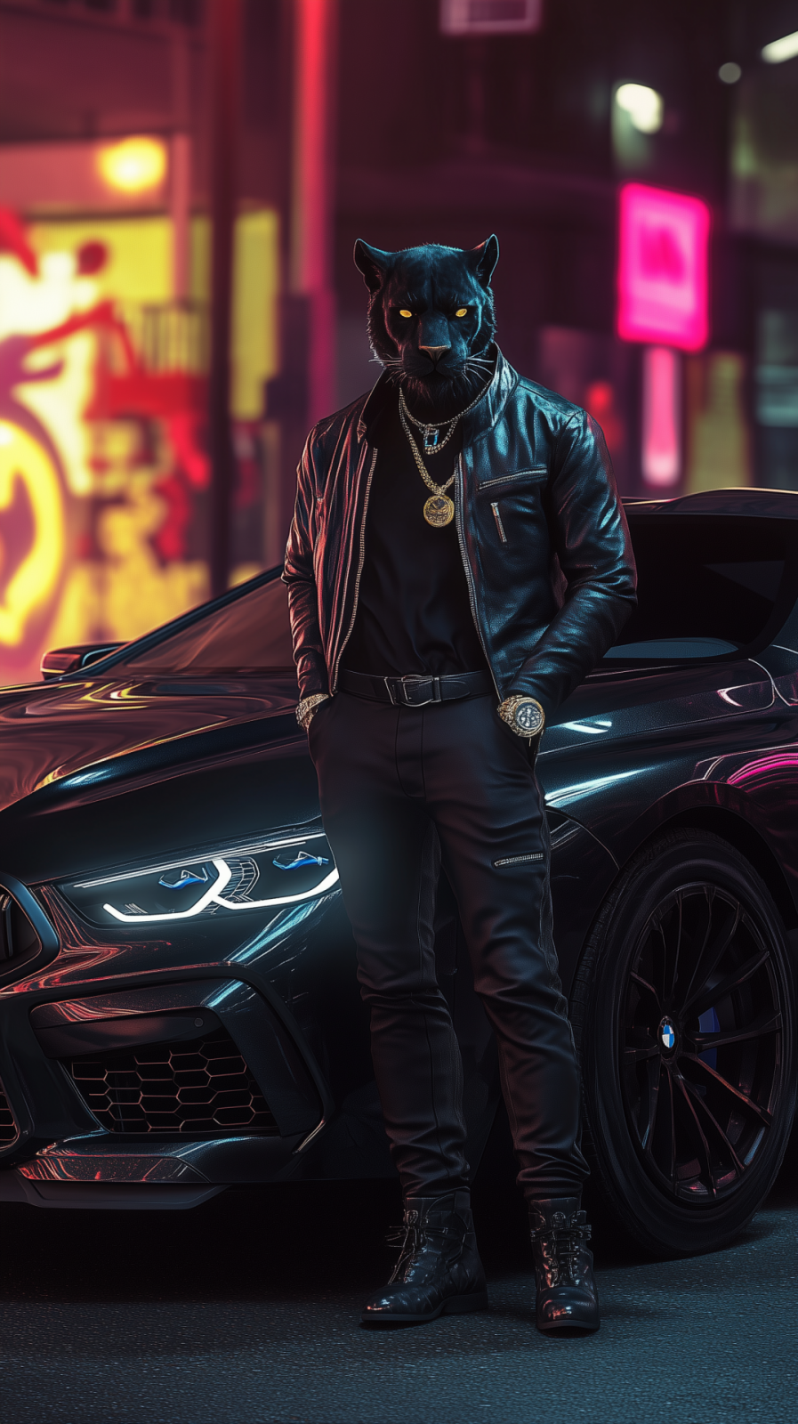 The image captures a hyperrealistic humanoid panther exuding a strong gangster vibe, standing beside a luxurious black BMW. Neon lights bathe the scene in vibrant colors, highlighting the panther's glossy fur and the car's sleek design.