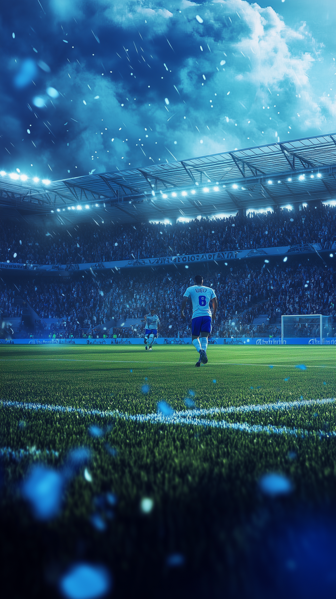 The image captures a vibrant matchday atmosphere at the RC Deportivo stadium, filled with enthusiastic blue and white fans. On the pitch, a player is seen in action, embodying the dynamic spirit of soccer.