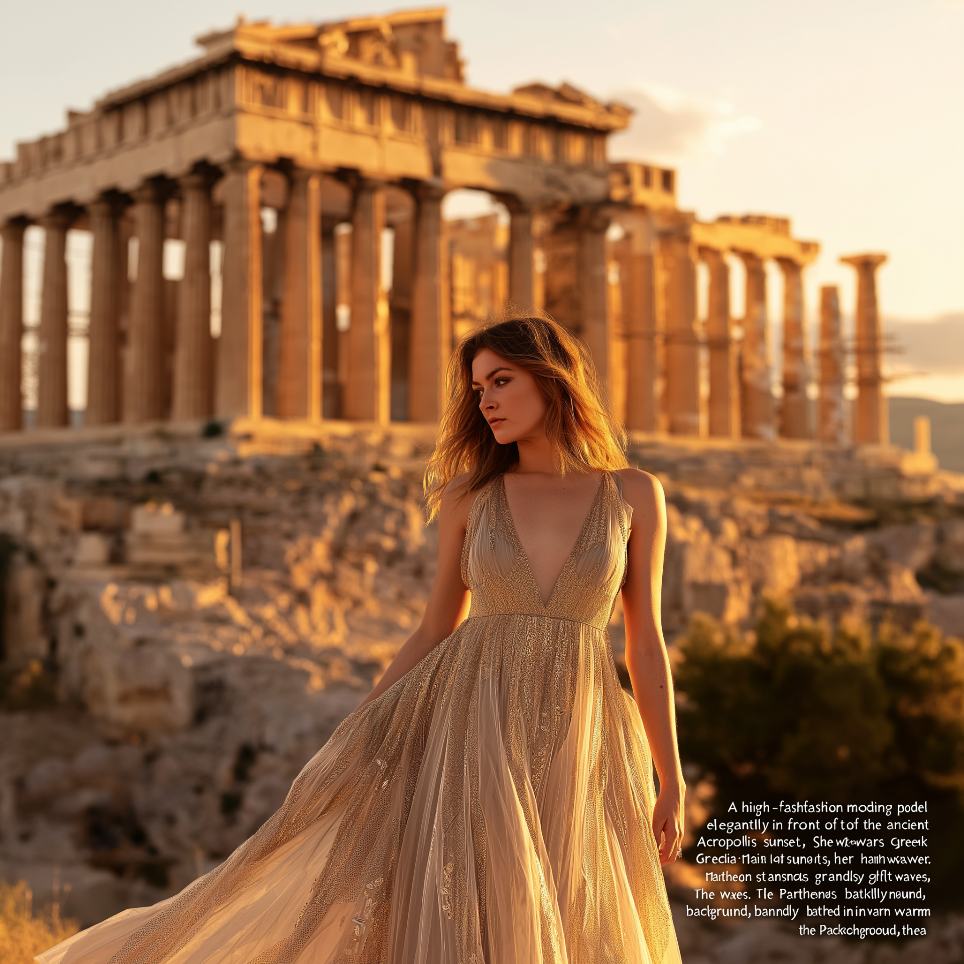 The image captures a stunning model posing gracefully against the backdrop of the ancient Greek Acropolis. The scene is filled with a sense of elegance and historical grandeur, highlighted by the soft sunlight illuminating the ancient structures.