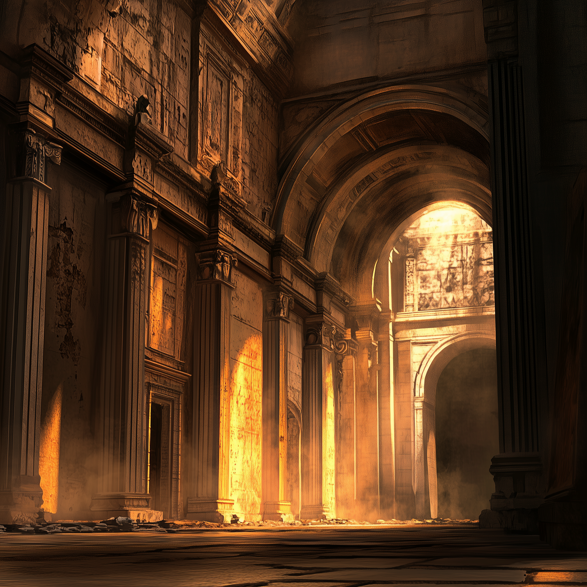 The image showcases a stunning view of intricately designed Roman arches, illuminated by dramatic lighting. The highly detailed architecture evokes a sense of grandeur and historical significance.