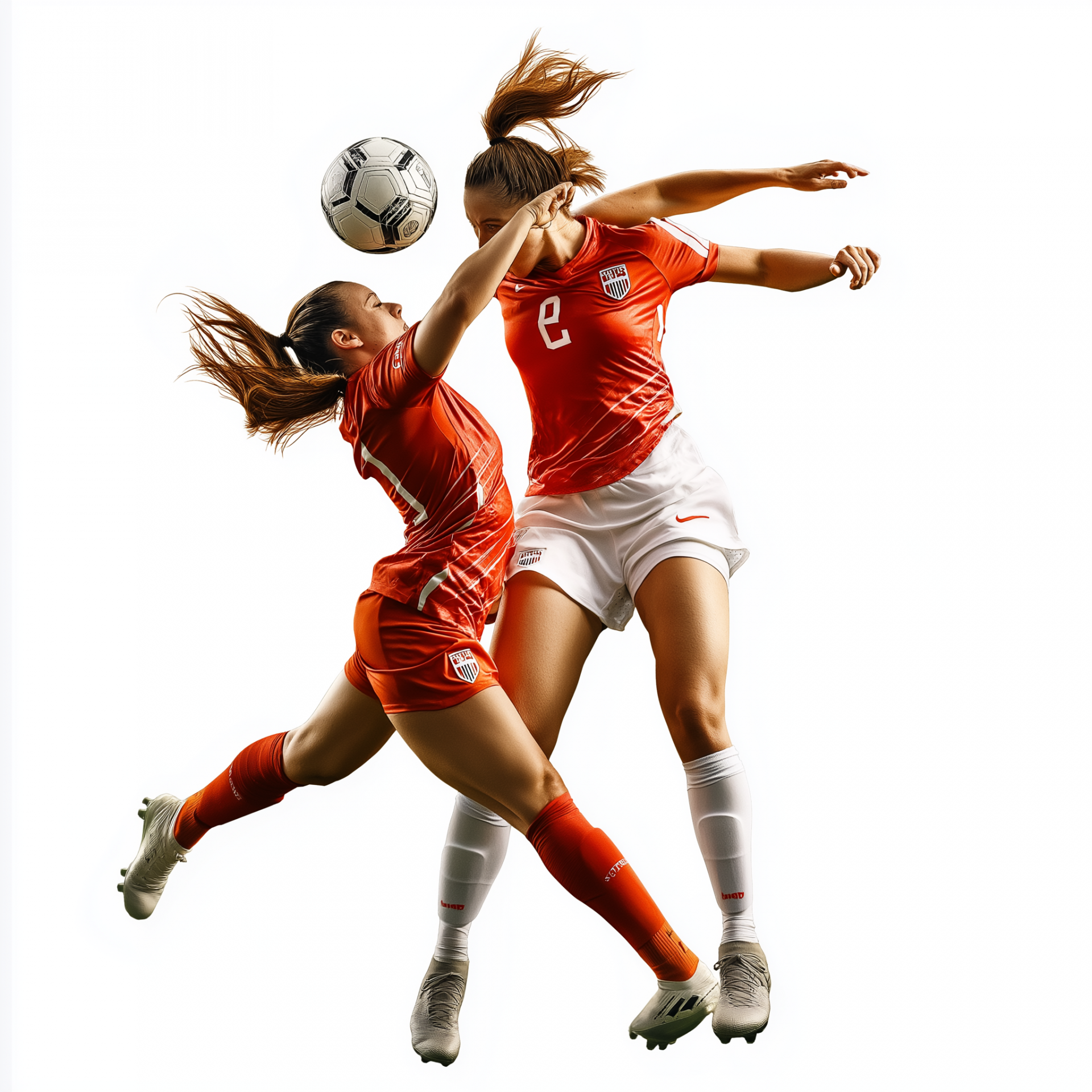 The image captures two soccer players in action, intensely fighting for a header. Set against a clean white background, the focus is on their determination and dynamic movement.