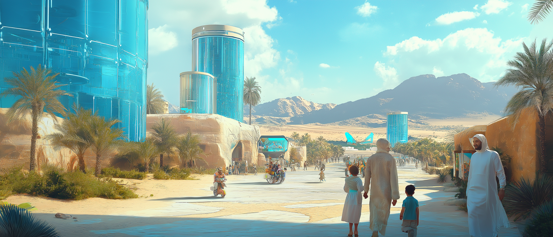 The image captures a vibrant scene of a family enjoying a futuristic theme park with interactive technology set against a stunning desert mountain plateau. Glimmering blue glass buildings and holograms create a captivating atmosphere, blending tradition with advanced technology.