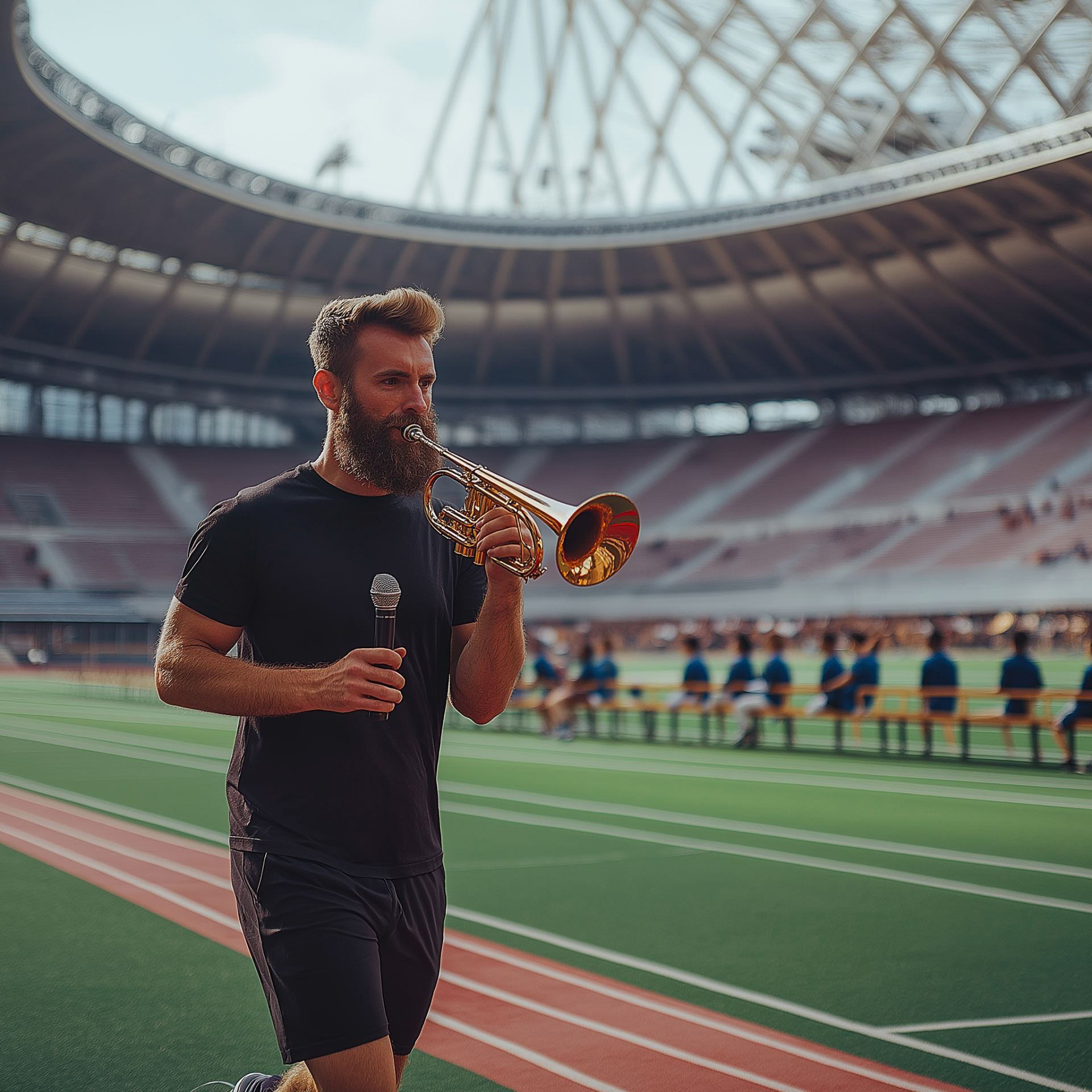 A bearded trainer energetically runs on an Olympic field, microphone in his ear and trumpet in hand. The scene captures a vibrant atmosphere with school benches arranged for the trainees in the middle of the stadium.