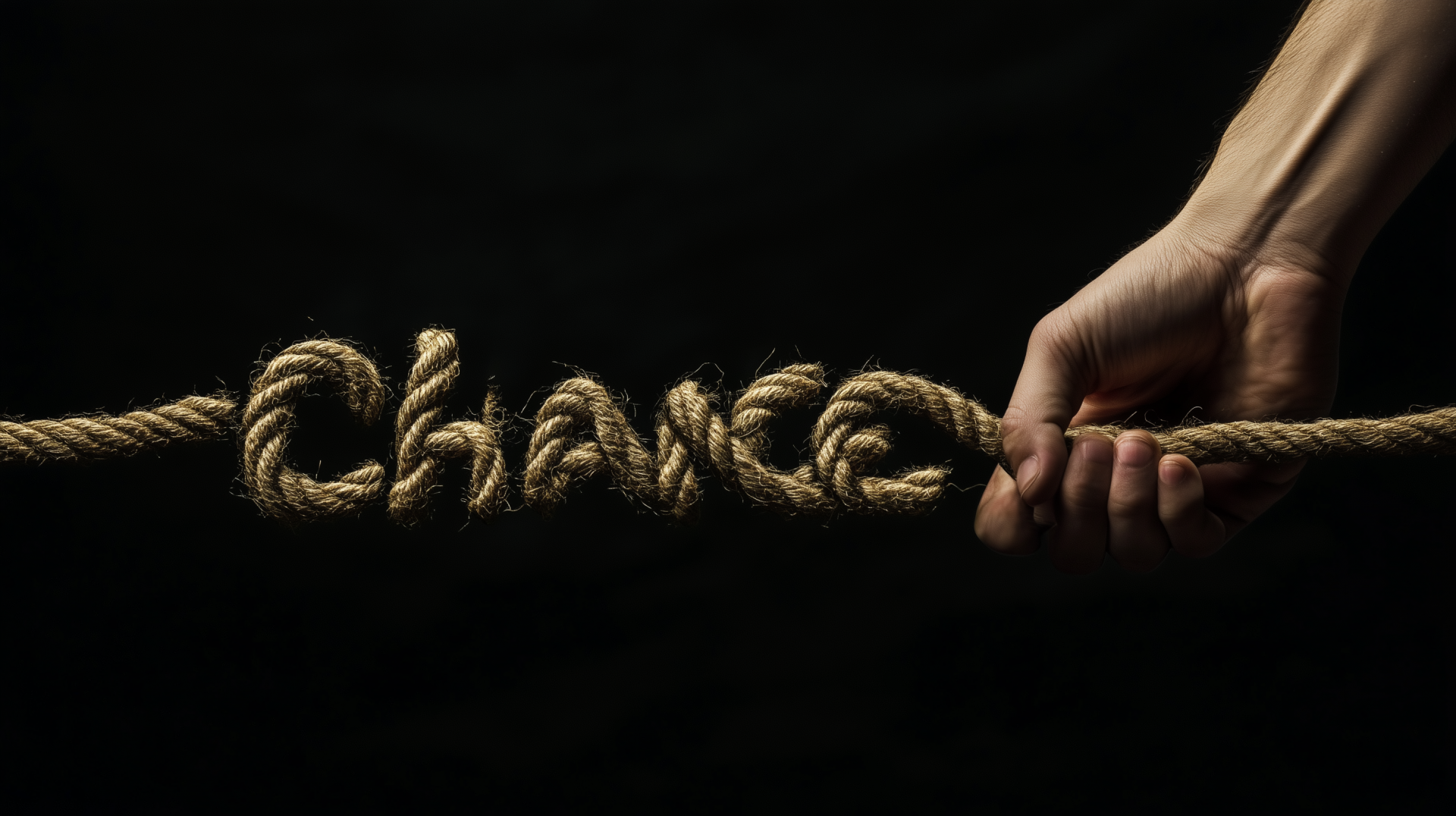The image features a person reaching for a rope sculpted to spell the word 'chance' against a stark black background. This captivating visual evokes a sense of opportunity and potential, contrasting the vibrant rope with the dark backdrop.