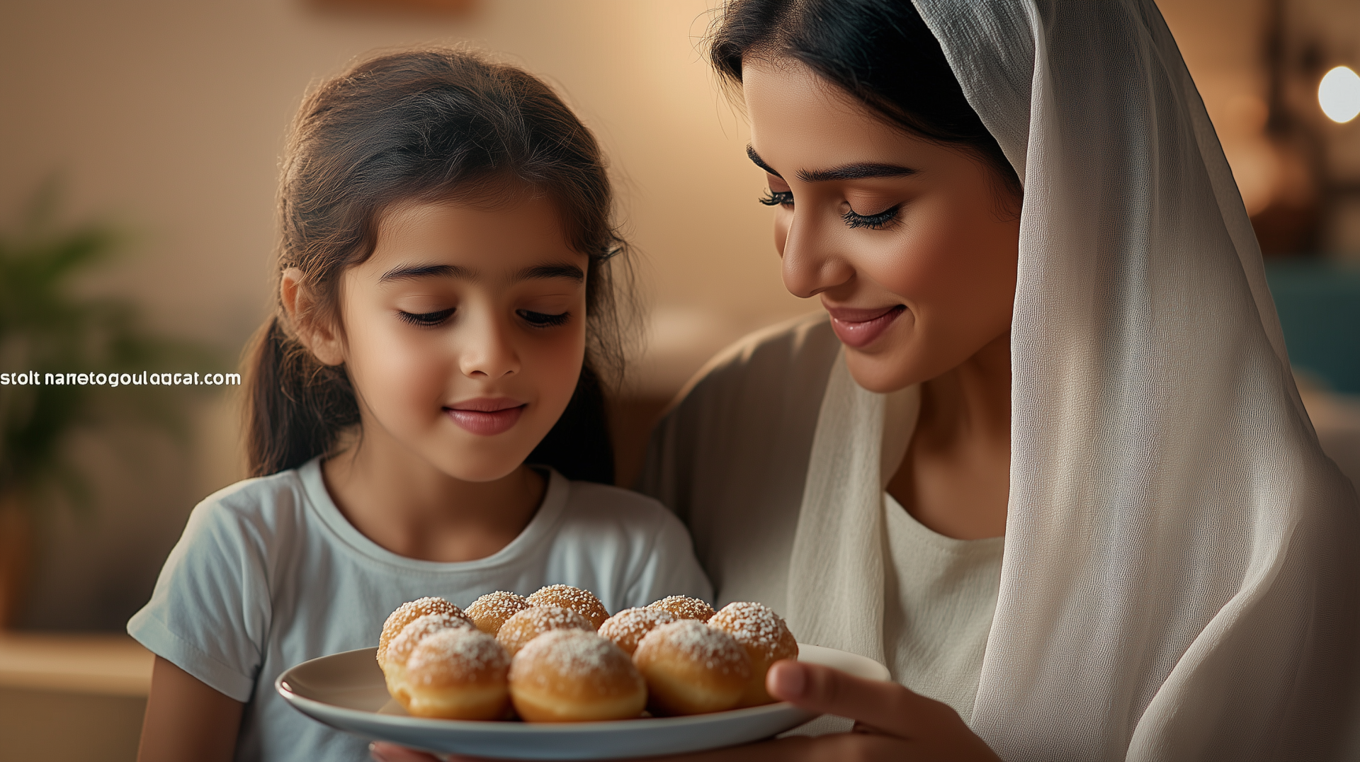 The image captures a warm moment between a mother and her daughter, reflecting love and comfort. The gentle colors and soft textures create a cozy atmosphere, highlighting the traditional attire and a delightful snack.