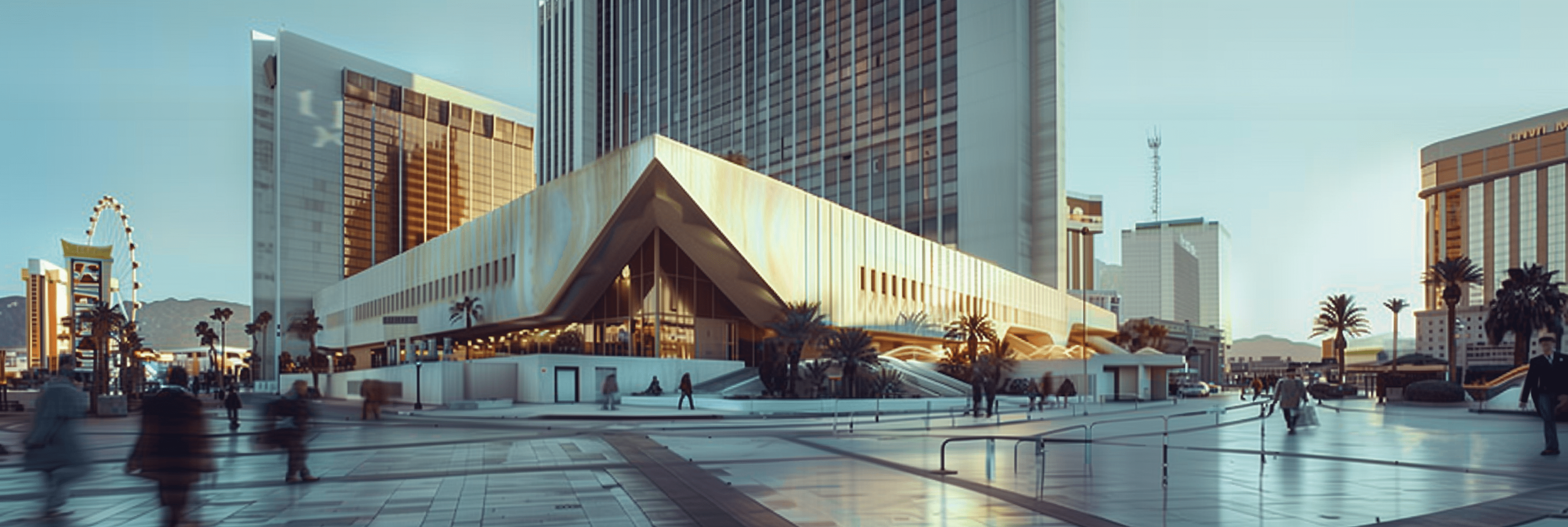 The image captures a striking example of brutalist architecture set against the backdrop of Las Vegas in 1979. Blurry figures move through the scene, adding a sense of dynamism and a touch of nostalgia to the Soviet-inspired structure.