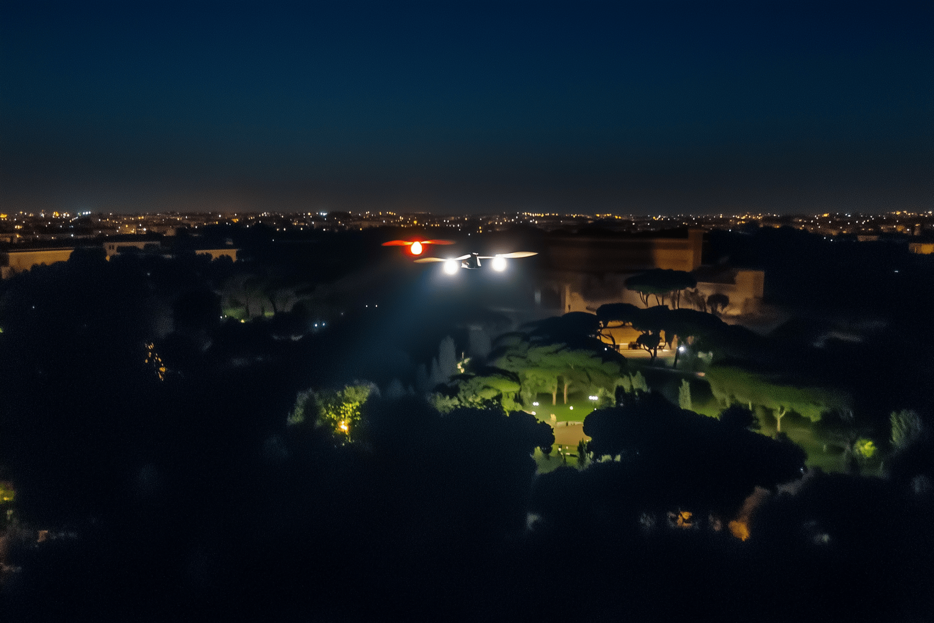 A captivating photo captures drones soaring over Villa Borghese, illuminating the serene night sky of Rome. The vibrant city lights and the lush greenery create a stunning contrast that evokes a sense of wonder and exploration.