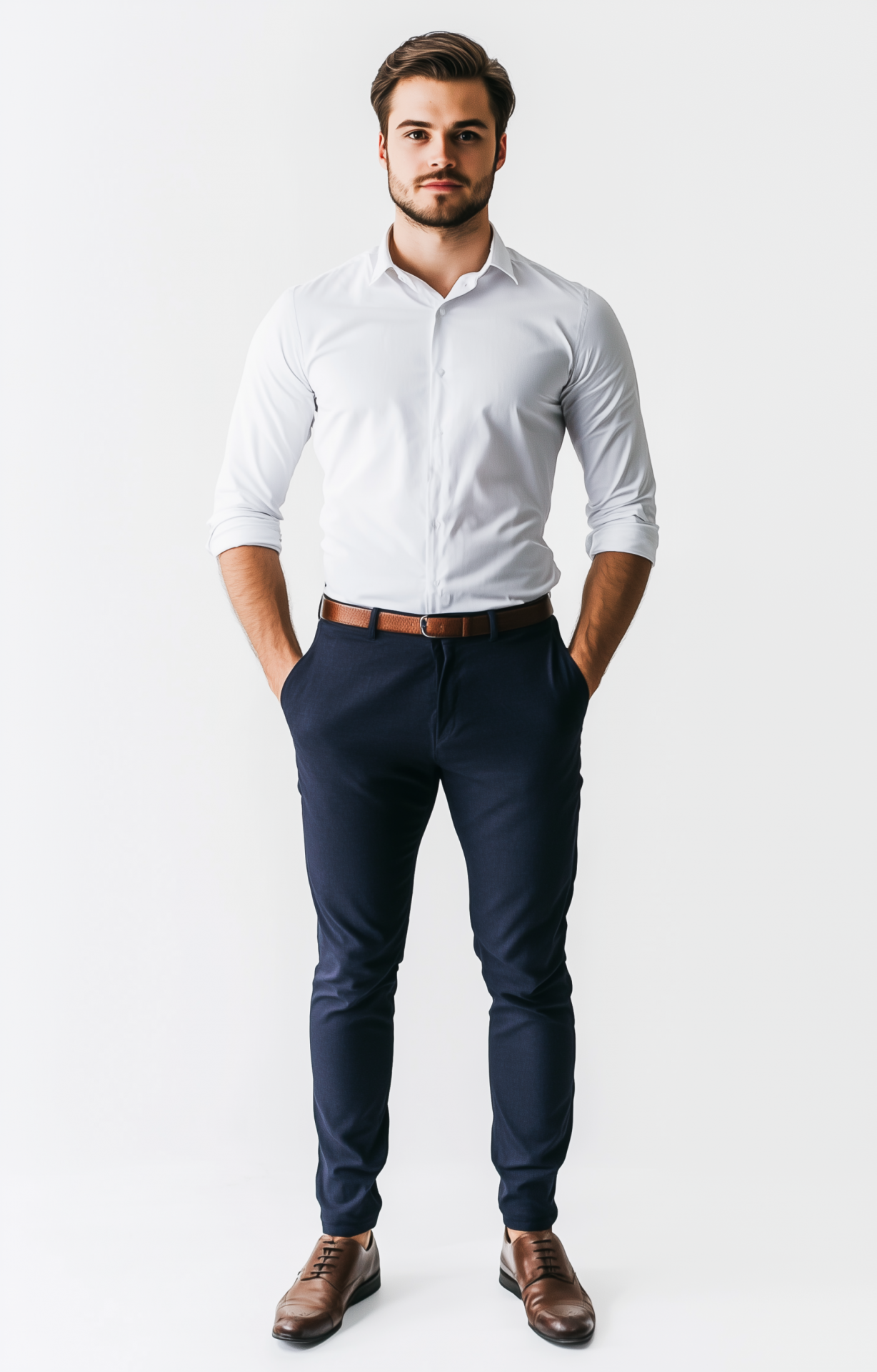 The image captures a young man dressed in a classic white button-down shirt and dark blue pants, exuding a professional aura. He stands confidently against a crisp white background, creating a clean and modern look.