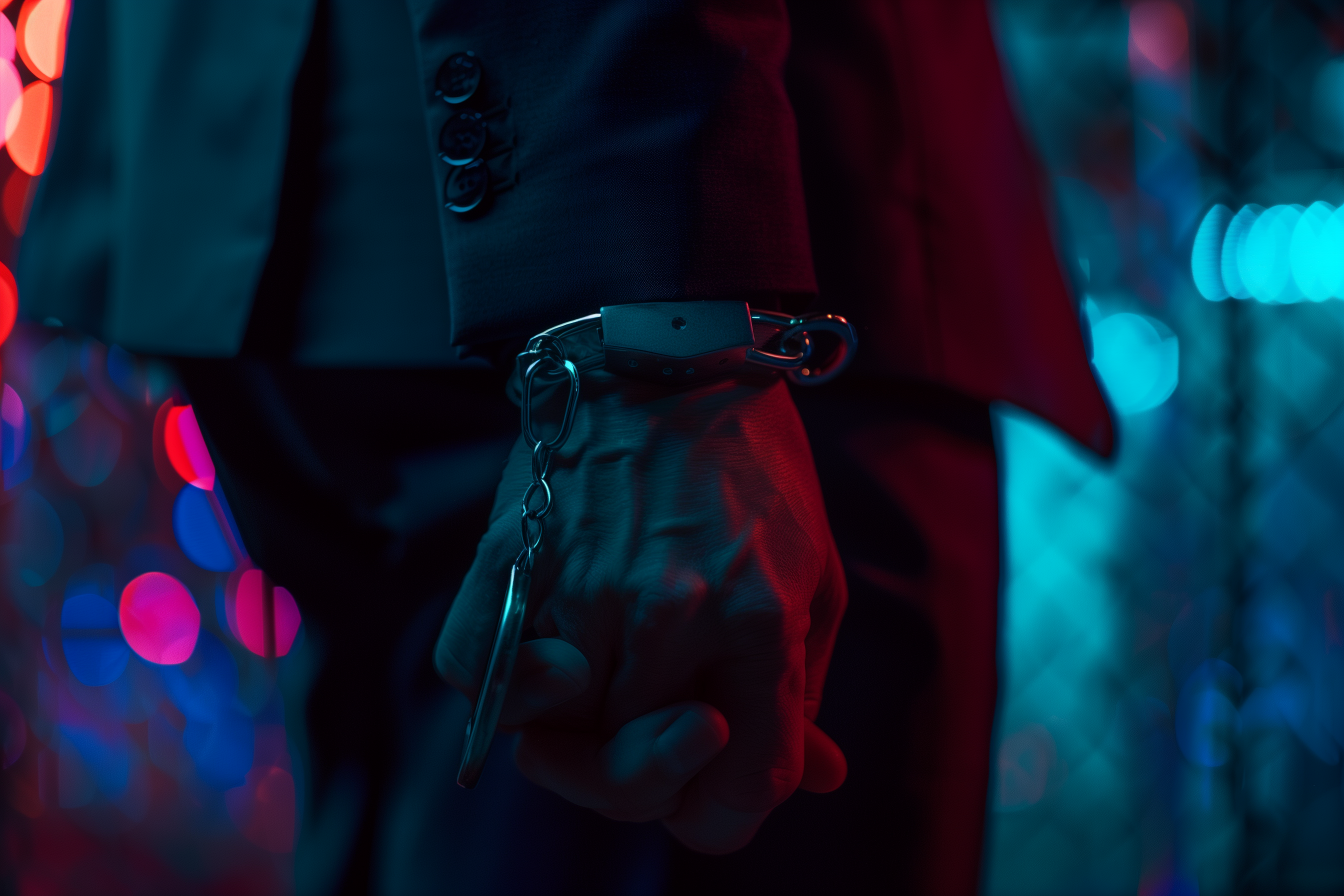 The image features a close-up of a pair of male hands adorned with handcuffs, dressed in a dark suit against a nighttime backdrop. The colors are pastel and the composition reflects a surreal style reminiscent of Wes Anderson's unique aesthetic.