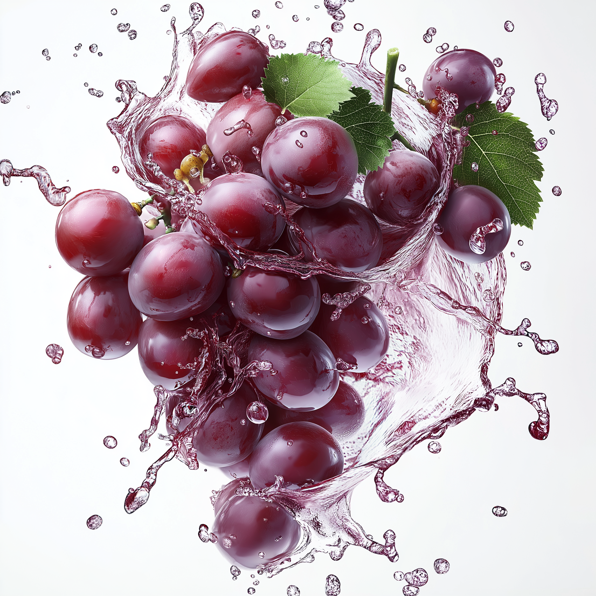 A vibrant and energetic image featuring grapes floating around splashes in a photorealistic style. The focus is on the product with a clean white background creating a refreshing and lively ambiance.