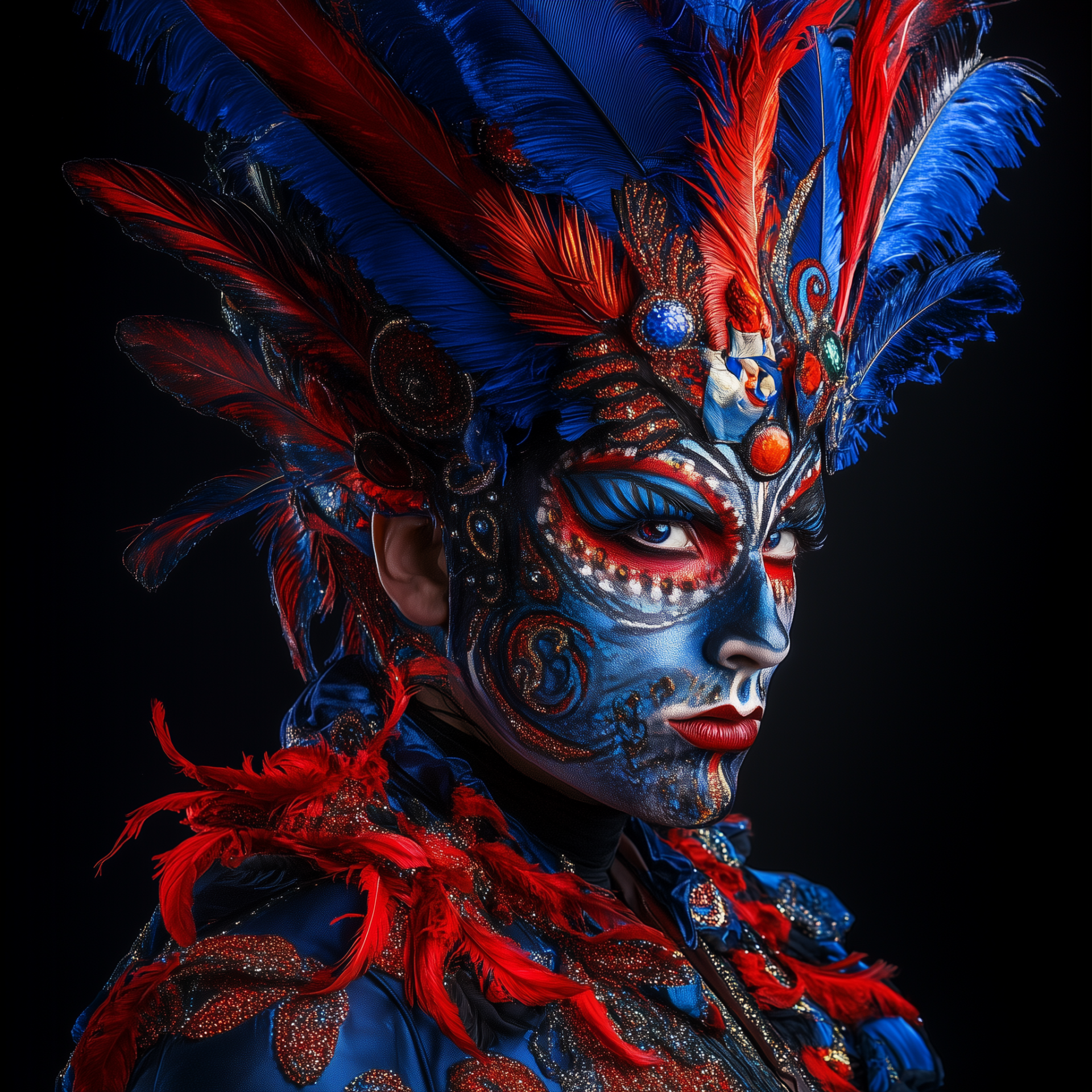 This image captures a carnival man in a dignified pose, surrounded by vivid explosions of energy in dark blue and red hues. The detailed costumes contrast against a solid black background, creating a striking and dynamic visual experience.