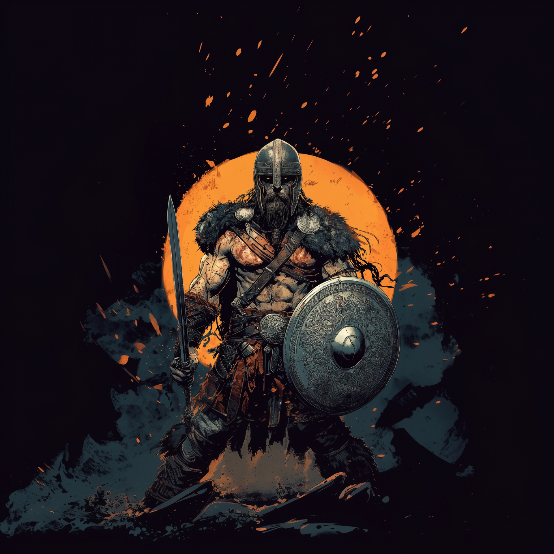 The image showcases a muscular viking warrior wearing a distinctive helmet, exuding strength and bravery. This comic book style illustration captures the essence of a fierce battle stance as he holds a sword and shield, radiating an epic aura.