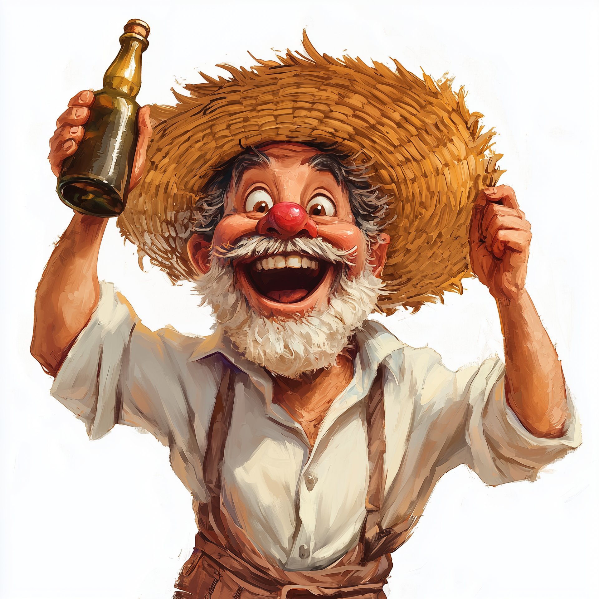 This illustration features a cheerful village man with a reddish nose and a straw hat. He holds a bottle in one hand while securing his hat with the other against a plain white background.