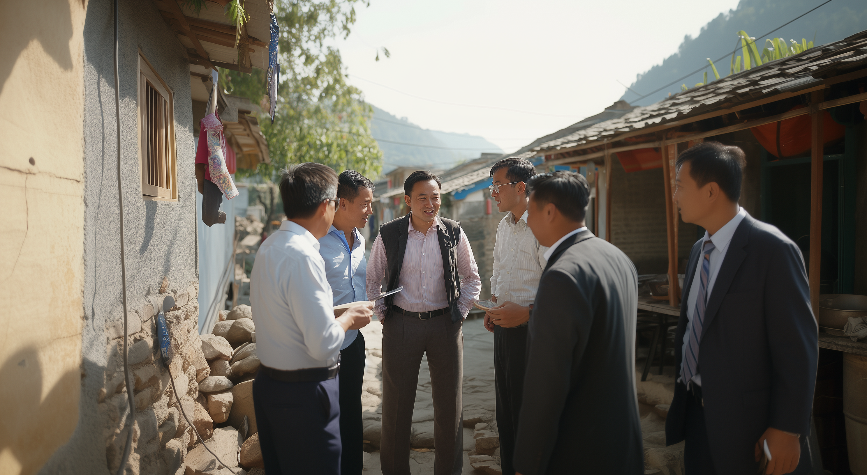 The image showcases five Asian men in formal attire, engaging in conversation with a family in an old village setting. The background features traditional architecture and a warm atmosphere, evoking a sense of community and cultural exchange.