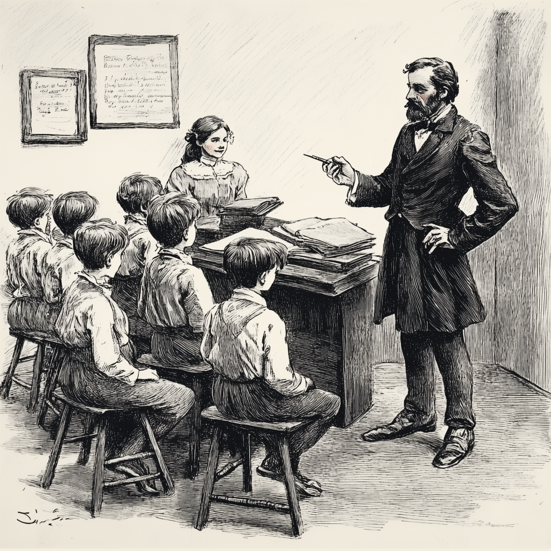 This illustration captures the essence of a teacher from the 1800s, depicted in a vintage style with intricate line work. The artwork evokes a sense of nostalgia with its delicate details and classic charm.