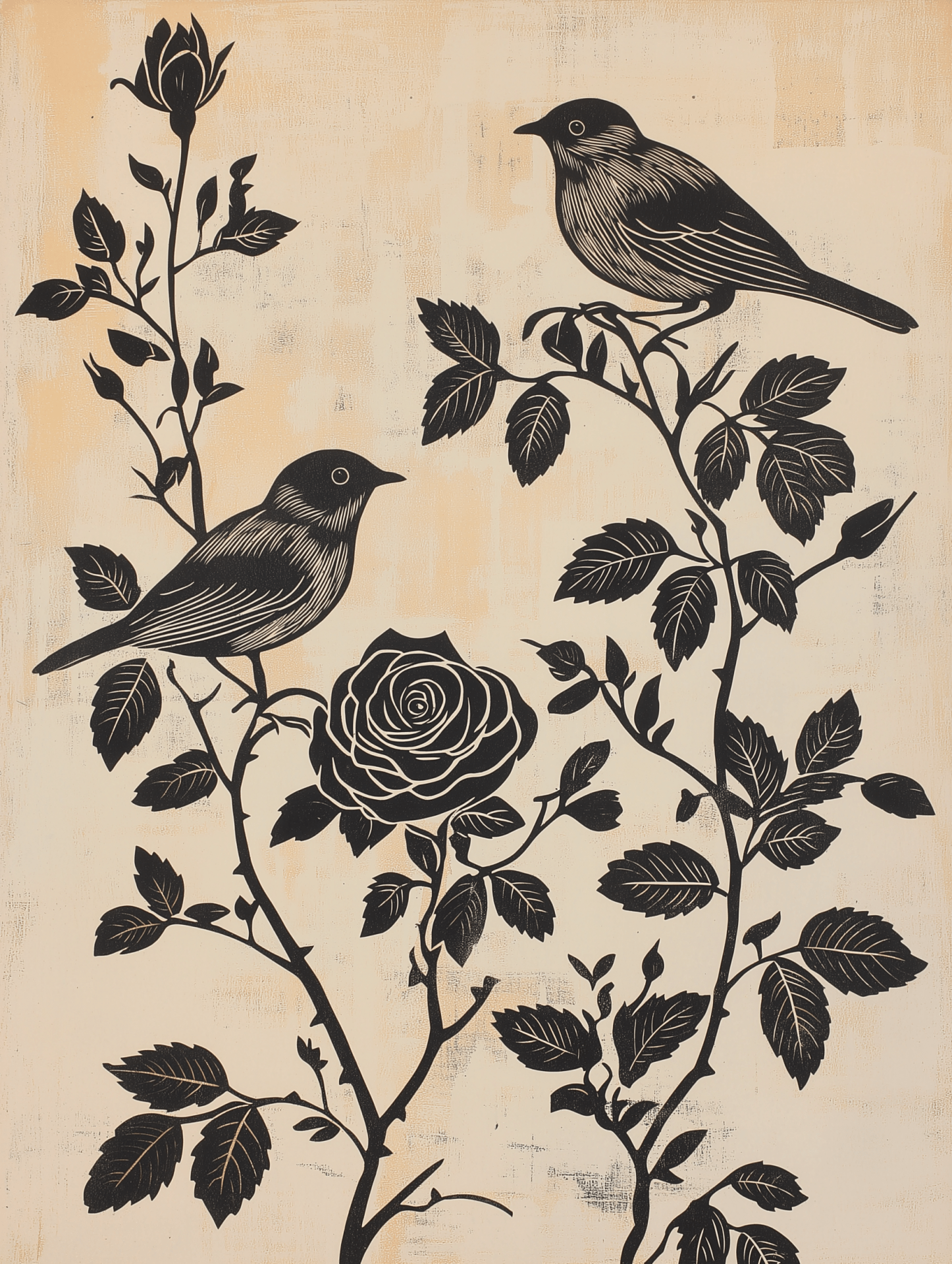The image presents a vintage woodblock print showcasing elegant birds on a rose bush branch. Intricate detailing combined with bold black outlines creates a timeless and classic aesthetic.