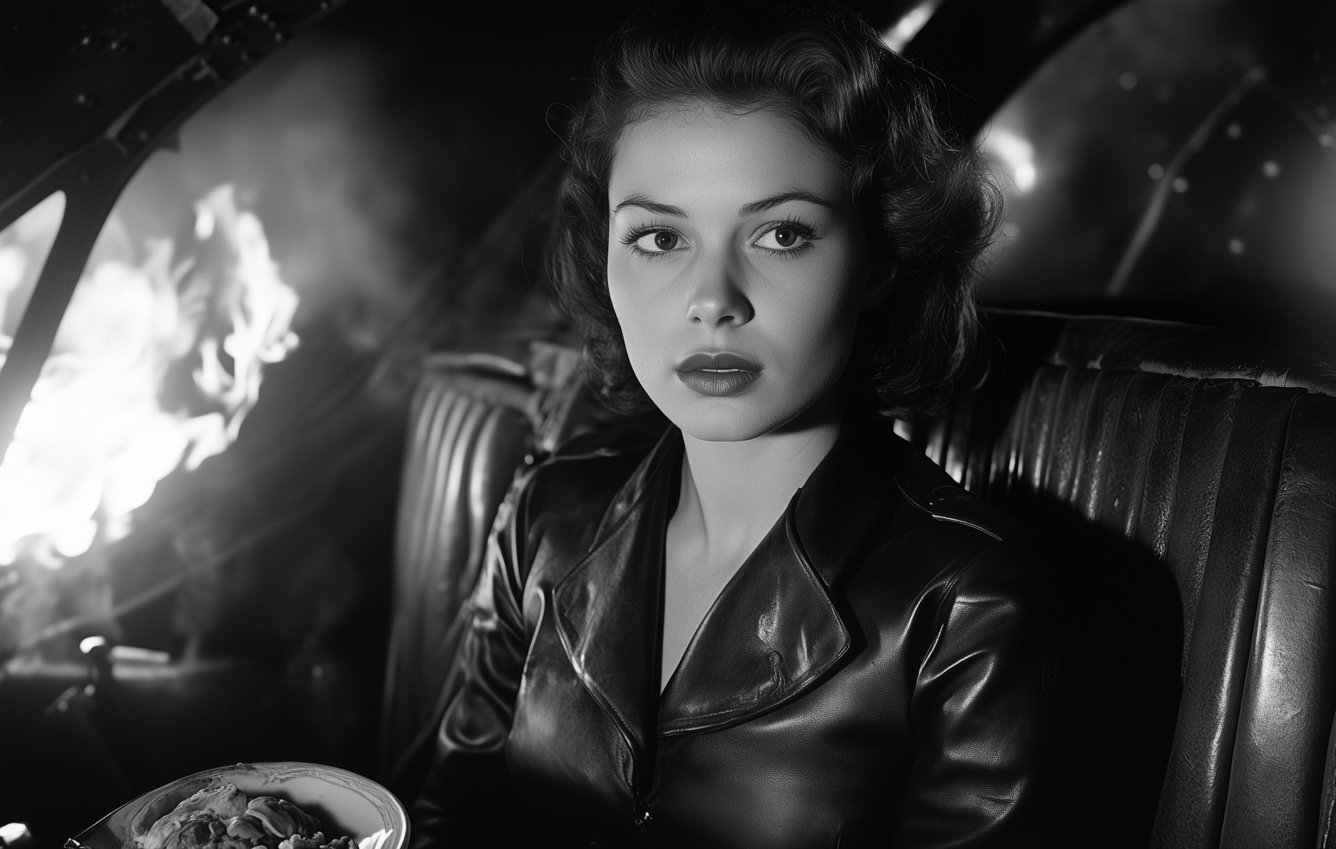The image showcases a female air hostess in a striking leather uniform, surrounded by the vintage charm of a World War II era airplane interior. The warm glow of fire reflects an atmosphere of tension, highlighting the contrast between service and chaos.