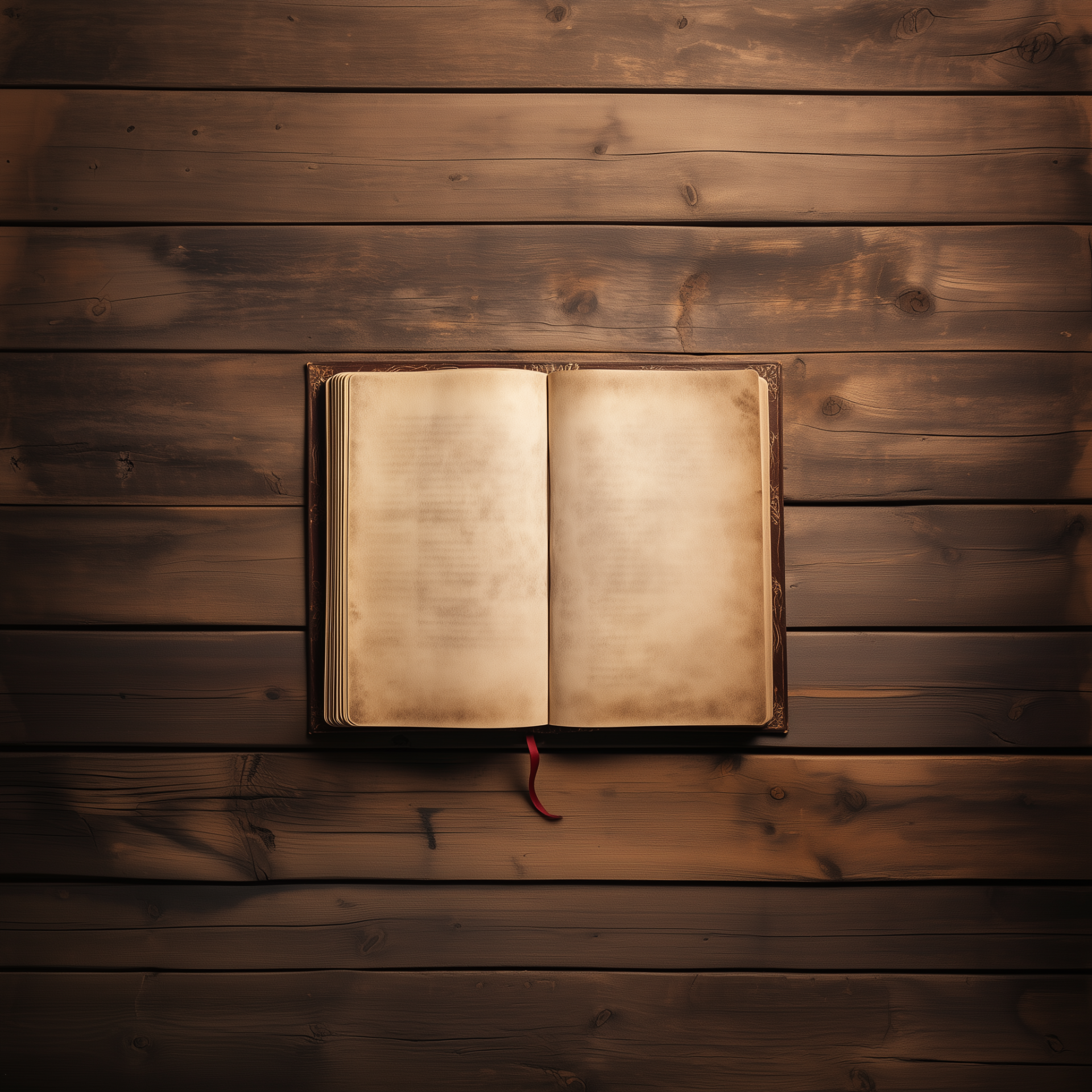 The image features an old vintage book lying open with a blank page visible from a top view. The aged pages and weathered cover give a sense of nostalgia and timelessness.