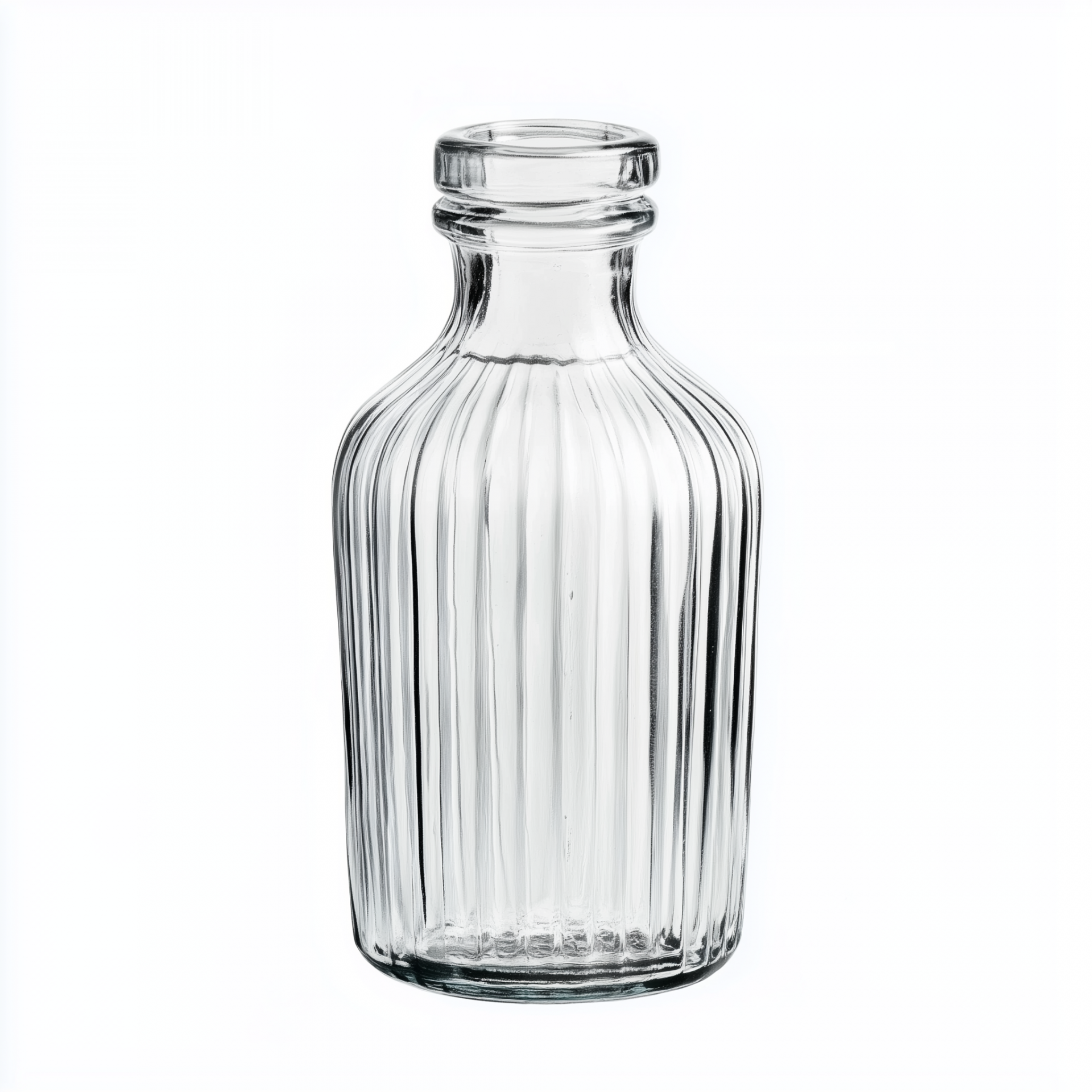 This image features a glass bottle with a fluted texture, showcasing a vintage aesthetic. The neutral white background emphasizes the elegance and classic design of the bottle.