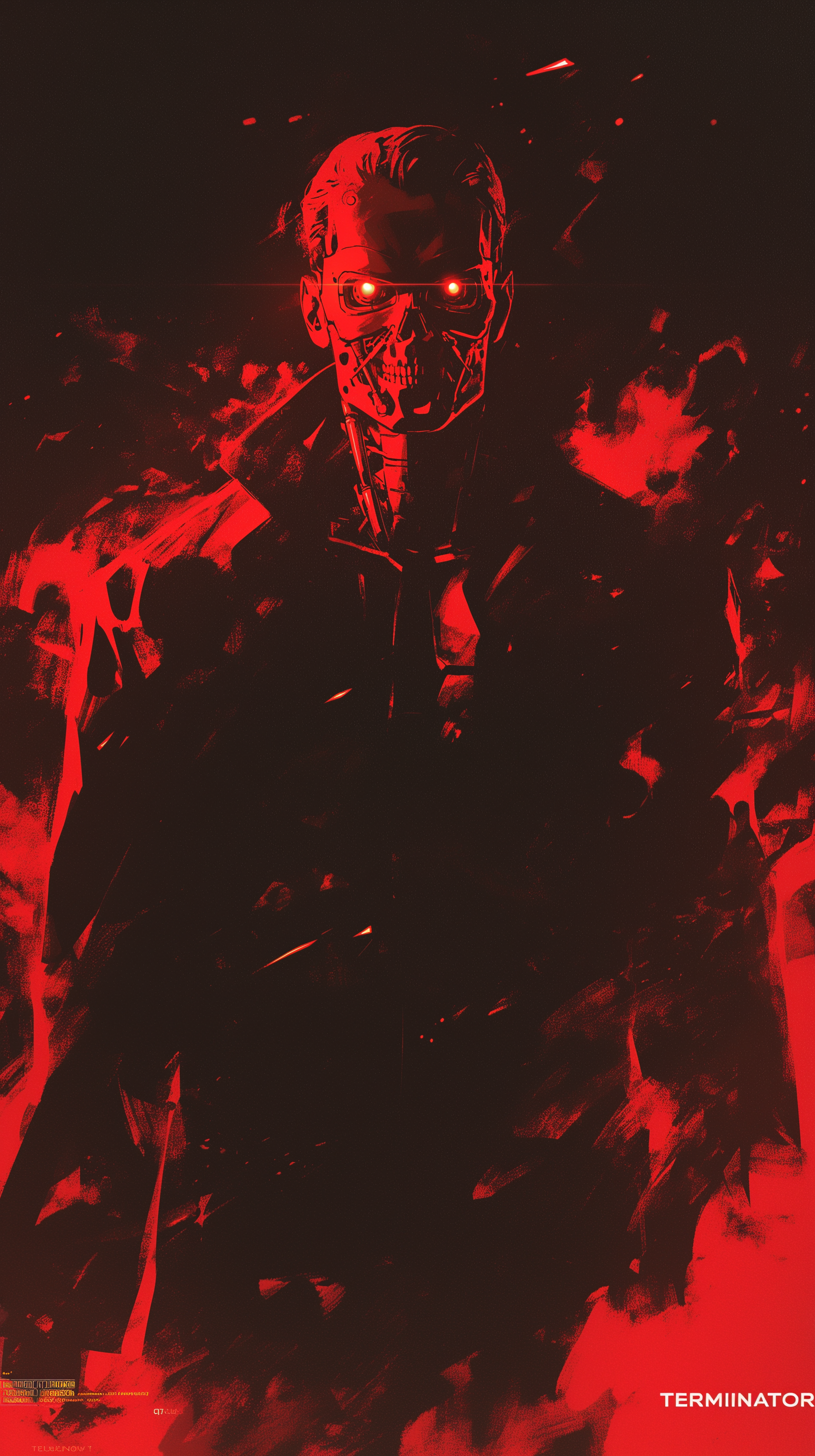 The image exudes a nostalgic charm with its vintage aesthetics reminiscent of 1950s cinema. A shadowy silhouette of a terminator stands against a harmonious blue background, captured in a dynamic angle that showcases masterful lighting and intricate details.
