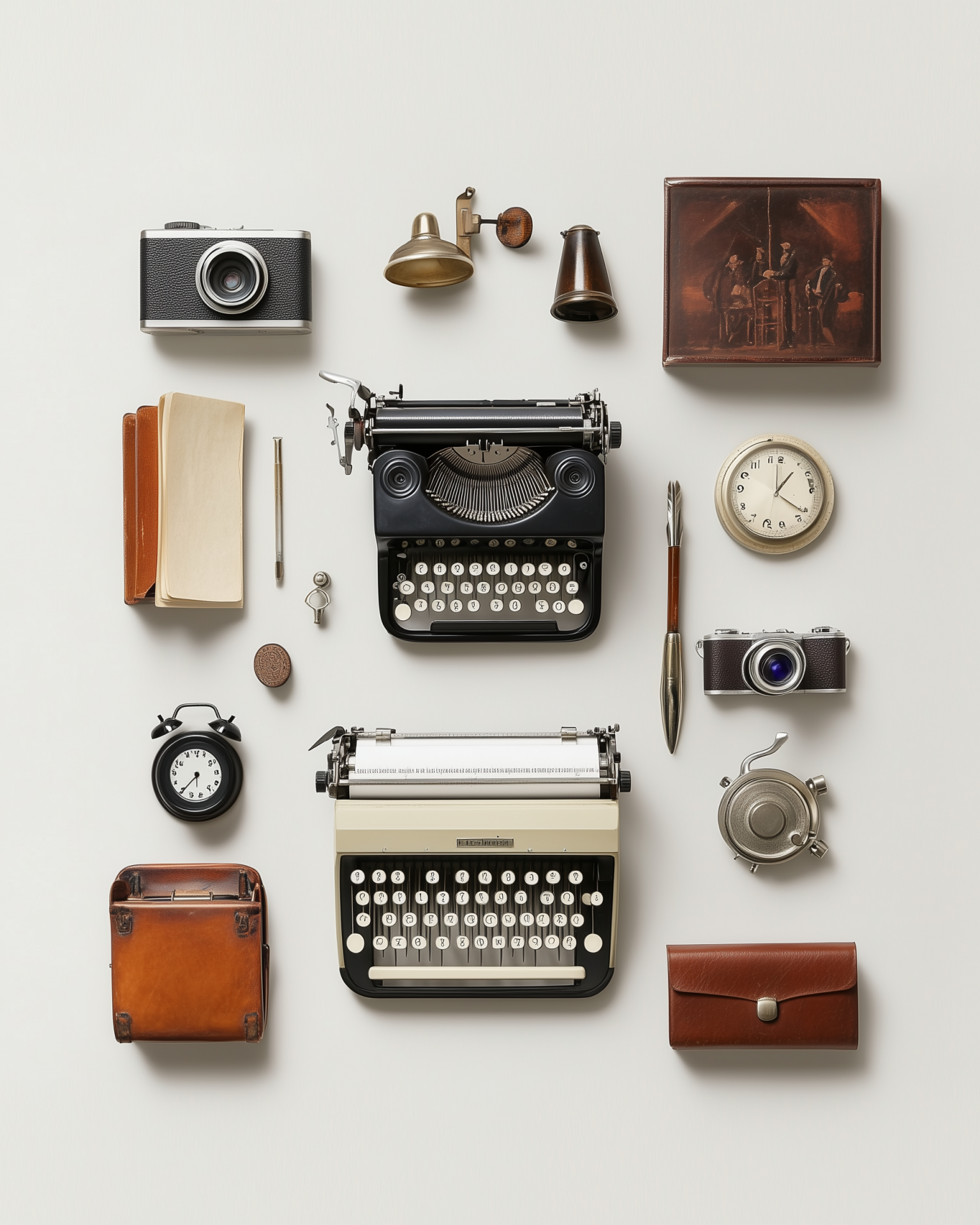 This image features a charming arrangement of vintage objects and people, beautifully displayed against a subtle light background. The meticulous spacing highlights the timeless appeal of each item, evoking a sense of nostalgia and elegance.