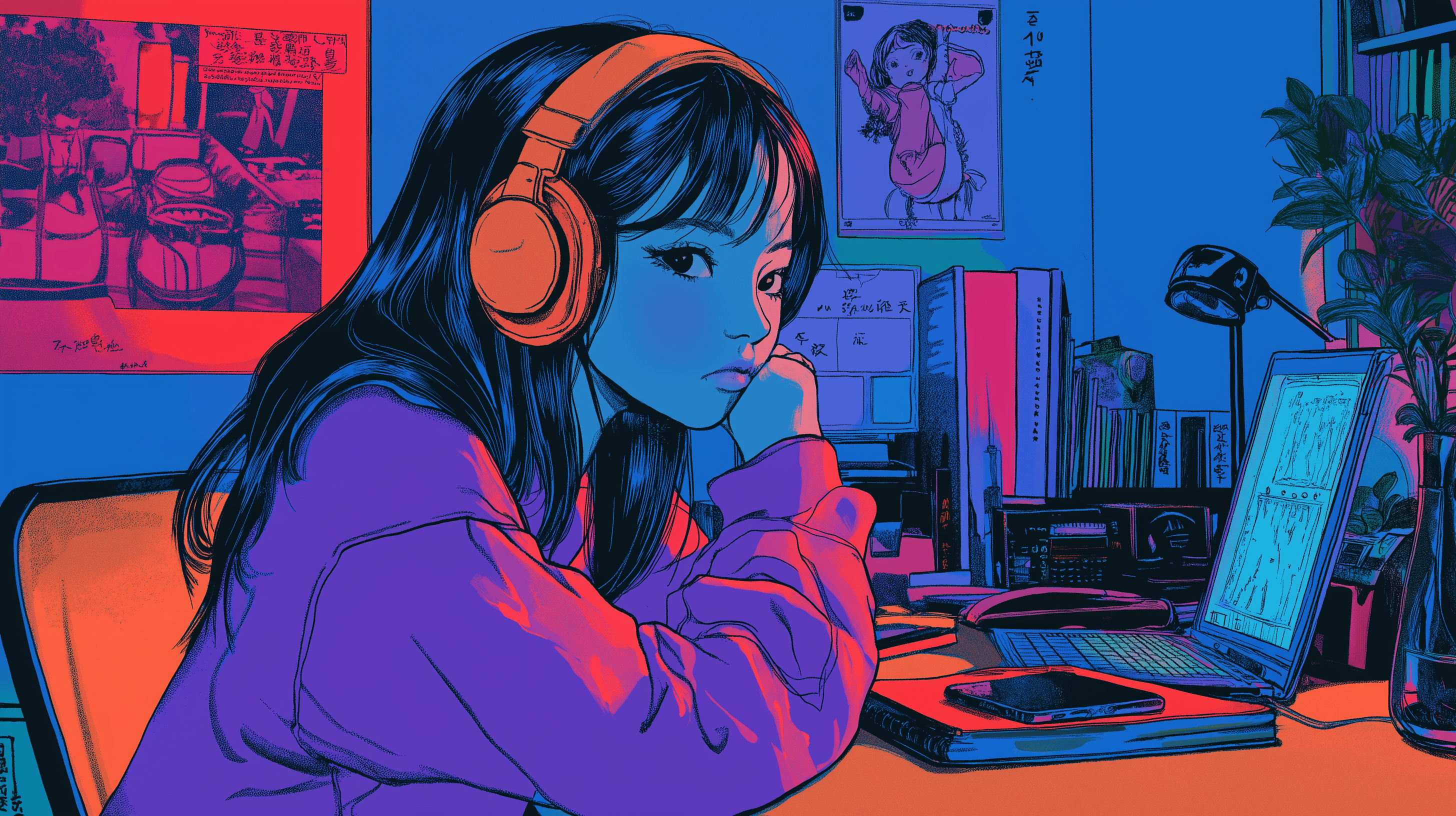 This image captures a cozy bedroom scene filled with retro vibes. A young Japanese girl is sitting comfortably in her room at night, wearing headphones and lost in the music.