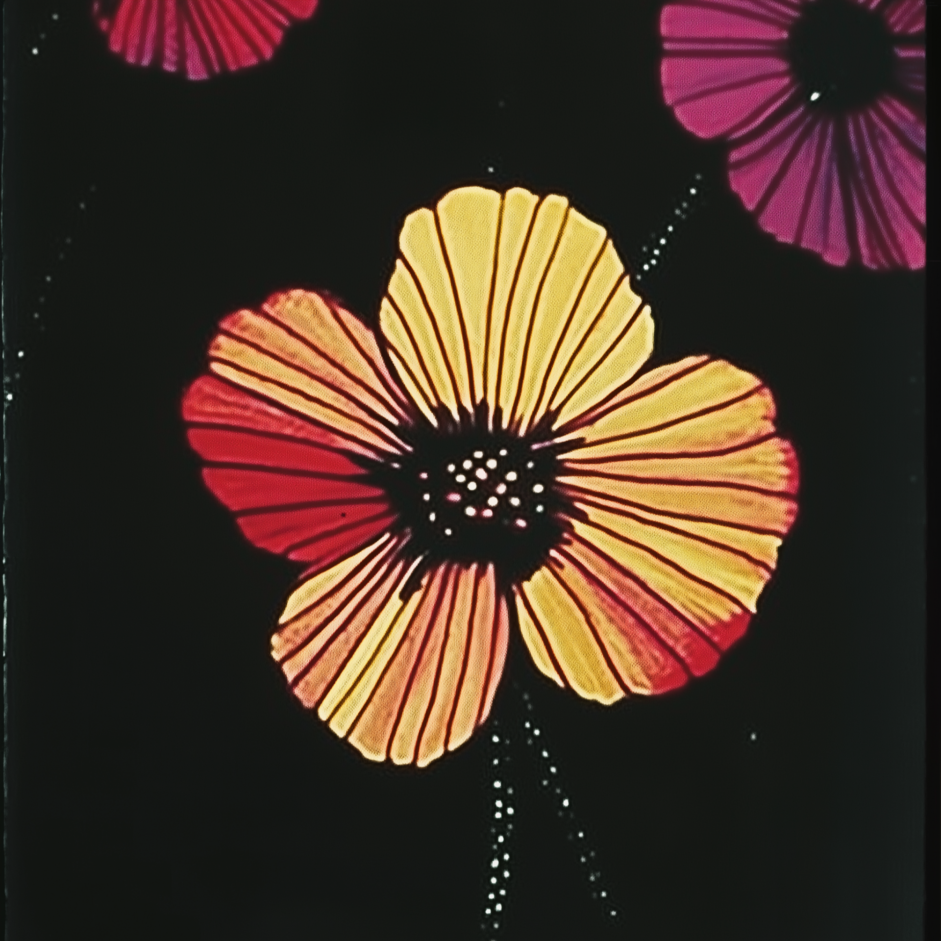 The image features a single flower elegantly displayed against a deep black background. Its retro style is emphasized by soft lighting and vintage color tones, creating a high contrast and slightly grainy aesthetic.