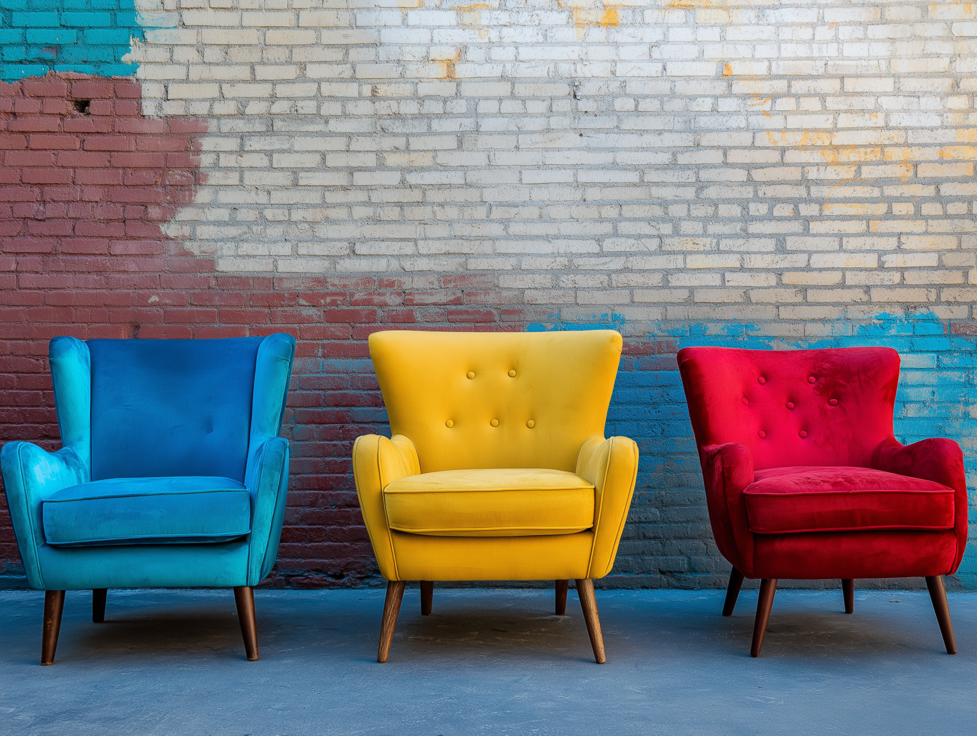 This image showcases three vintage chairs in an array of vibrant colors, creating a lively and inviting atmosphere. The blue velvet armchair stands out alongside a striking red chair, combined with other unique designs that add character to the space.