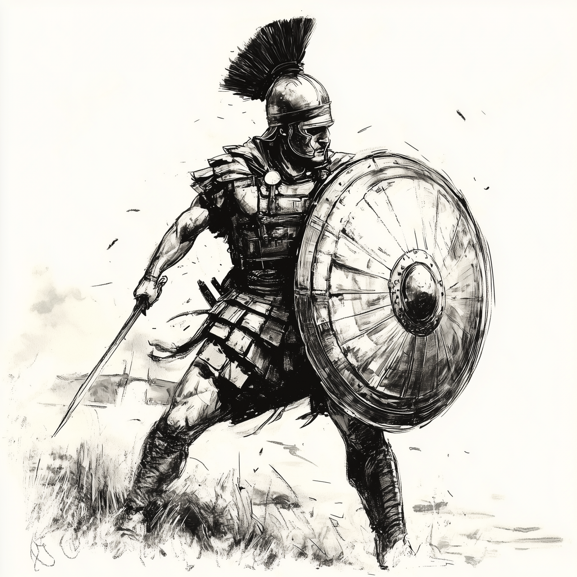 A powerful black and white sketch depicting a Roman soldier poised for battle, gripping his shield tightly. The illustration captures the intensity and valor of ancient warfare, with intricate details highlighting the soldier's armor and stance.