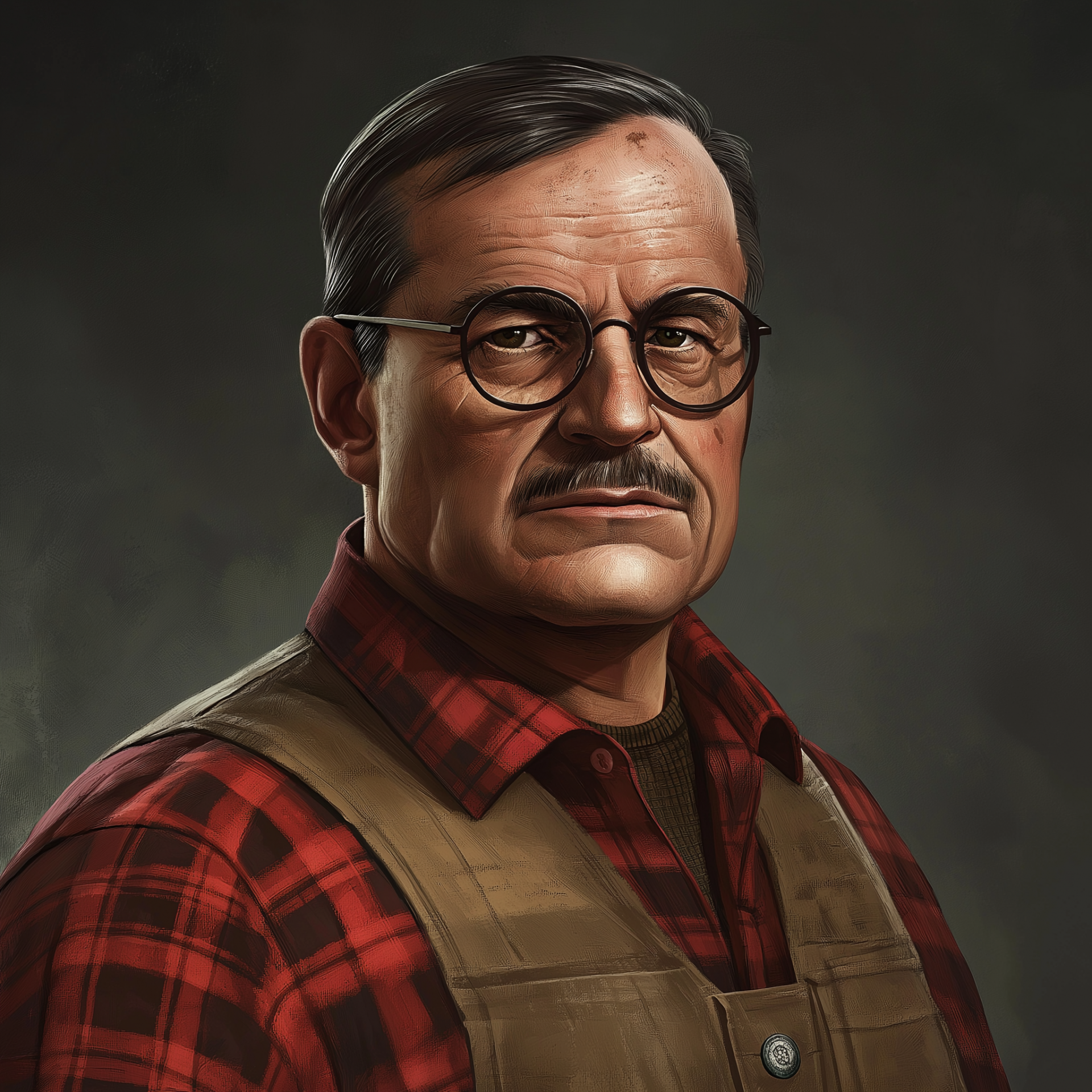 The image features a sturdy looking middle-aged man with a 1970s aesthetic. His dark hair is slightly balding and combed to the side, complemented by thick round glasses and a thin mustache, all adding to his distinctive character.