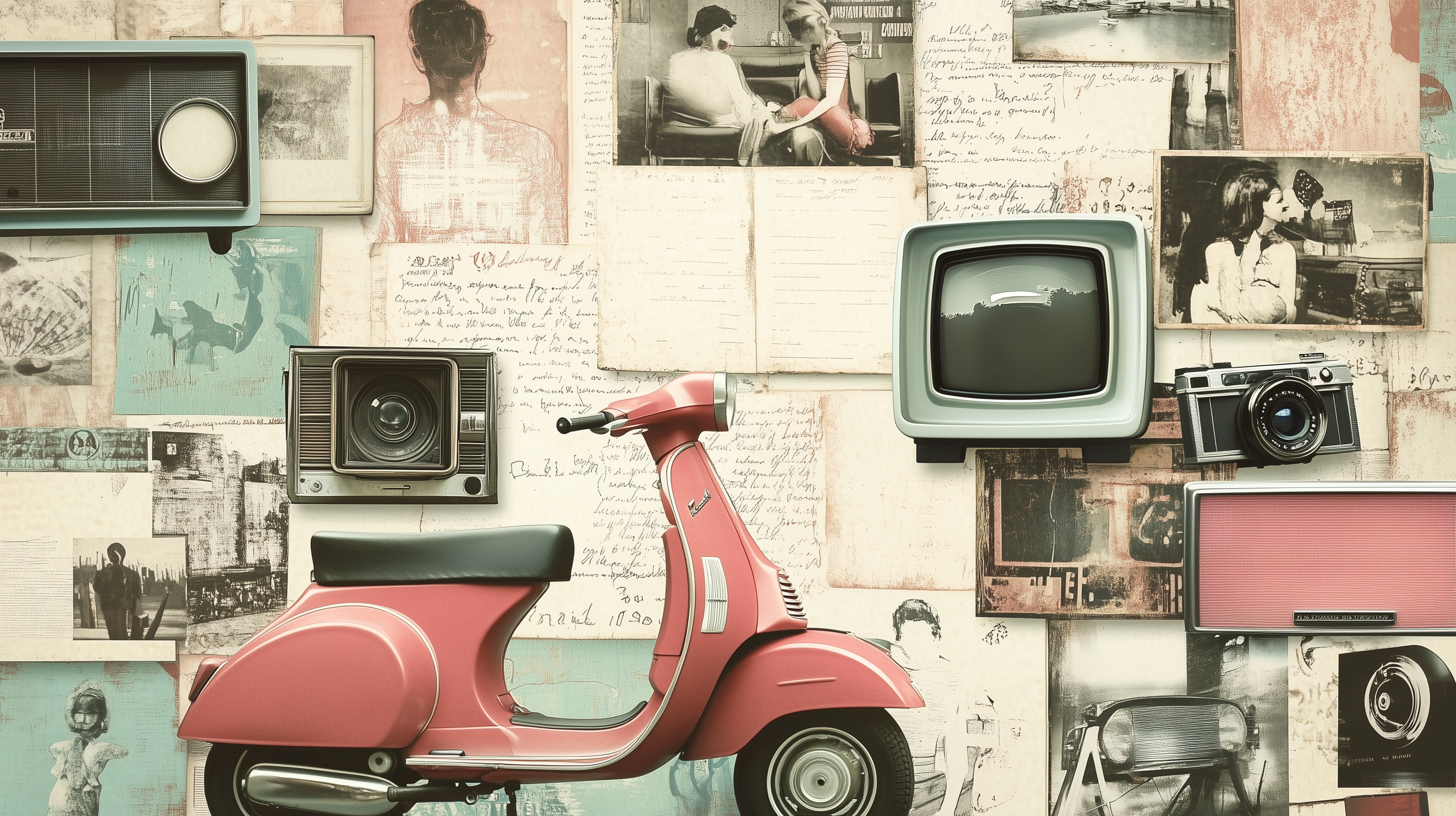 A visual collage capturing the essence of retro and vintage aesthetics, featuring elements like old-fashioned cameras, classic Vespa scooters, vintage TVs, handwritten notes, and vinyl records.