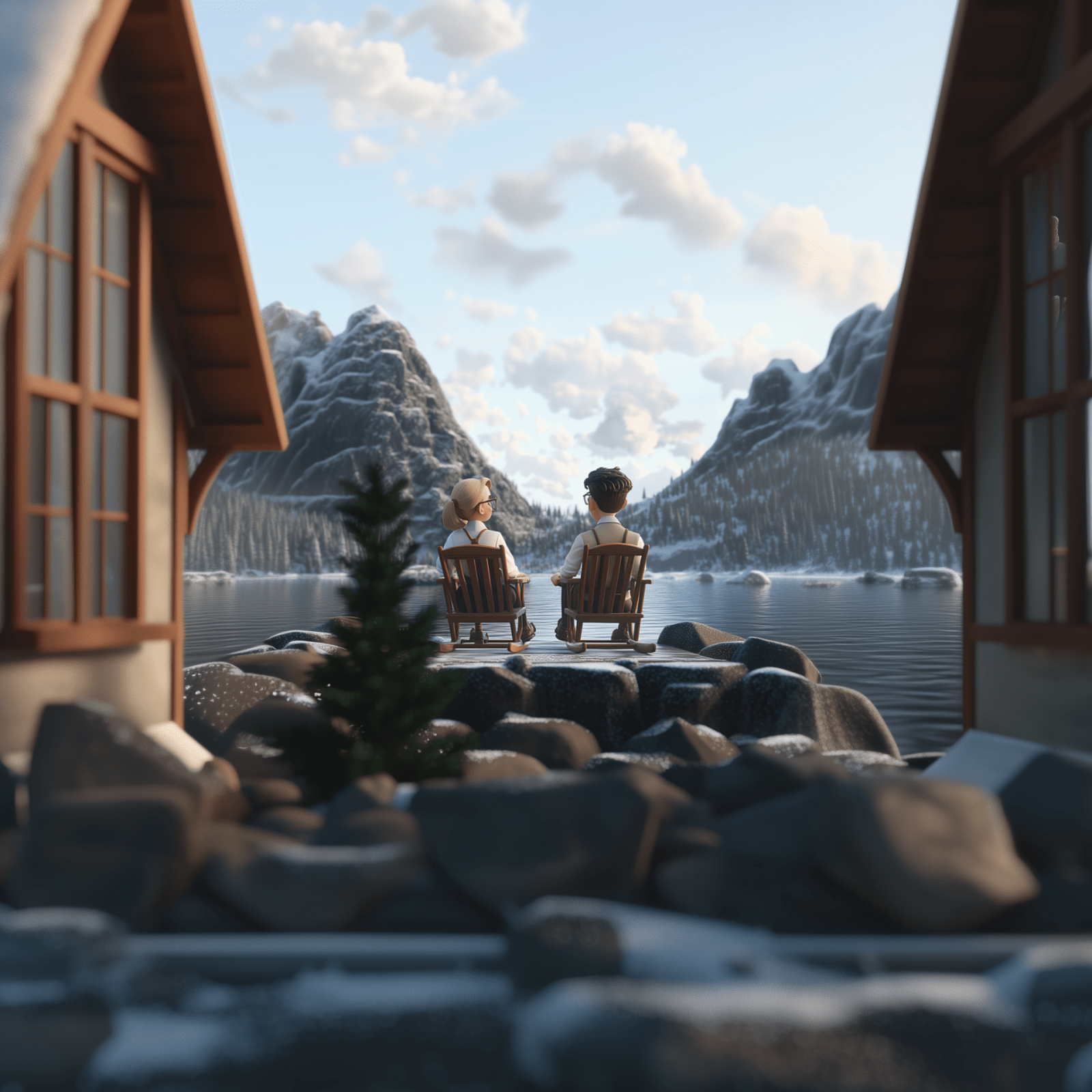 This image captures a nostalgic scene of two characters enjoying a tranquil moment at a mountain resort. The cinematic styling evokes a warm, inviting ambiance, complemented by the snowy surroundings.