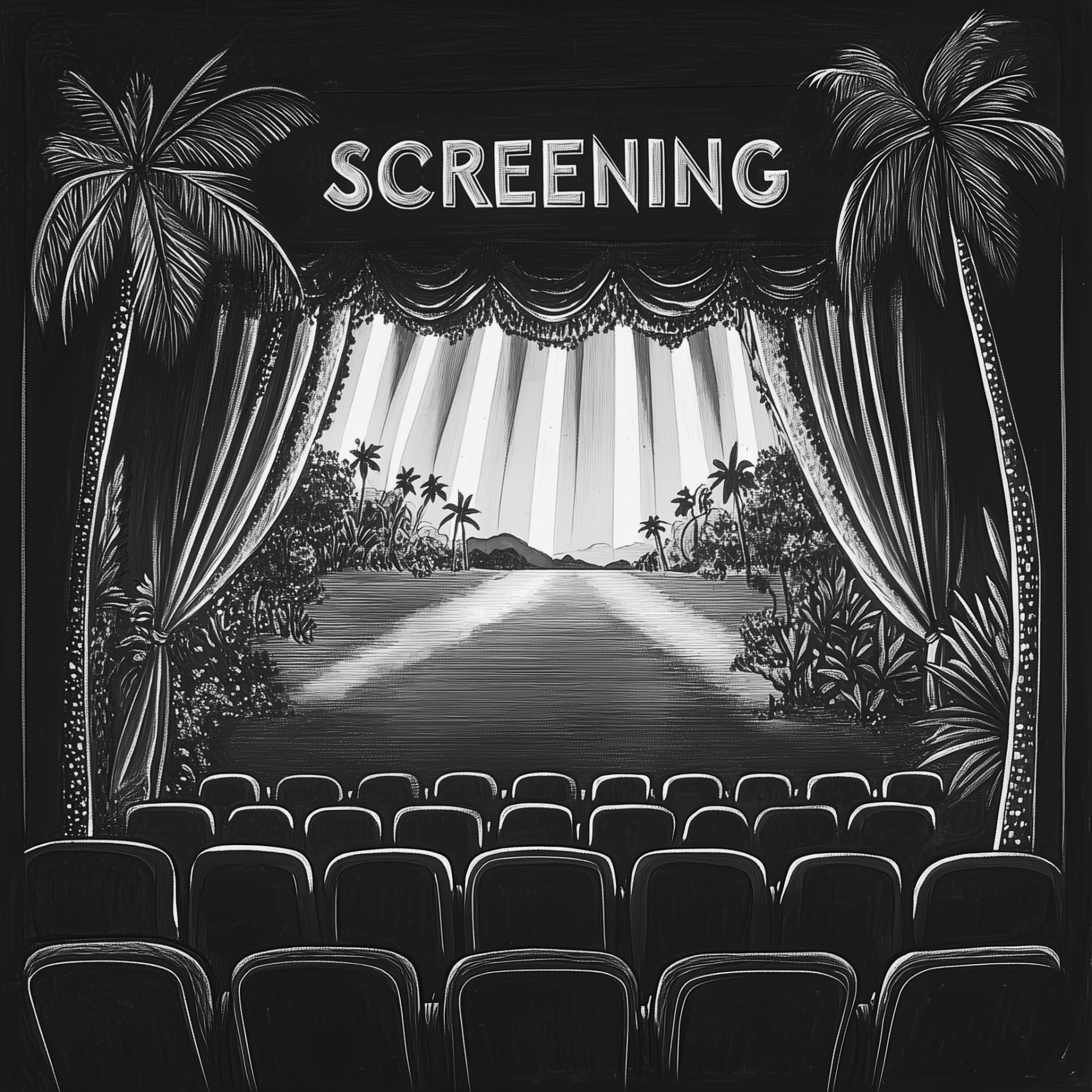 The illustration showcases a nostalgic vintage movie theatre with a marquee reading 'SCREENING'. It features 30 luxurious seats surrounded by art nouveau elements, palm trees, and a black and white aesthetic that captures the essence of classic Hollywood.