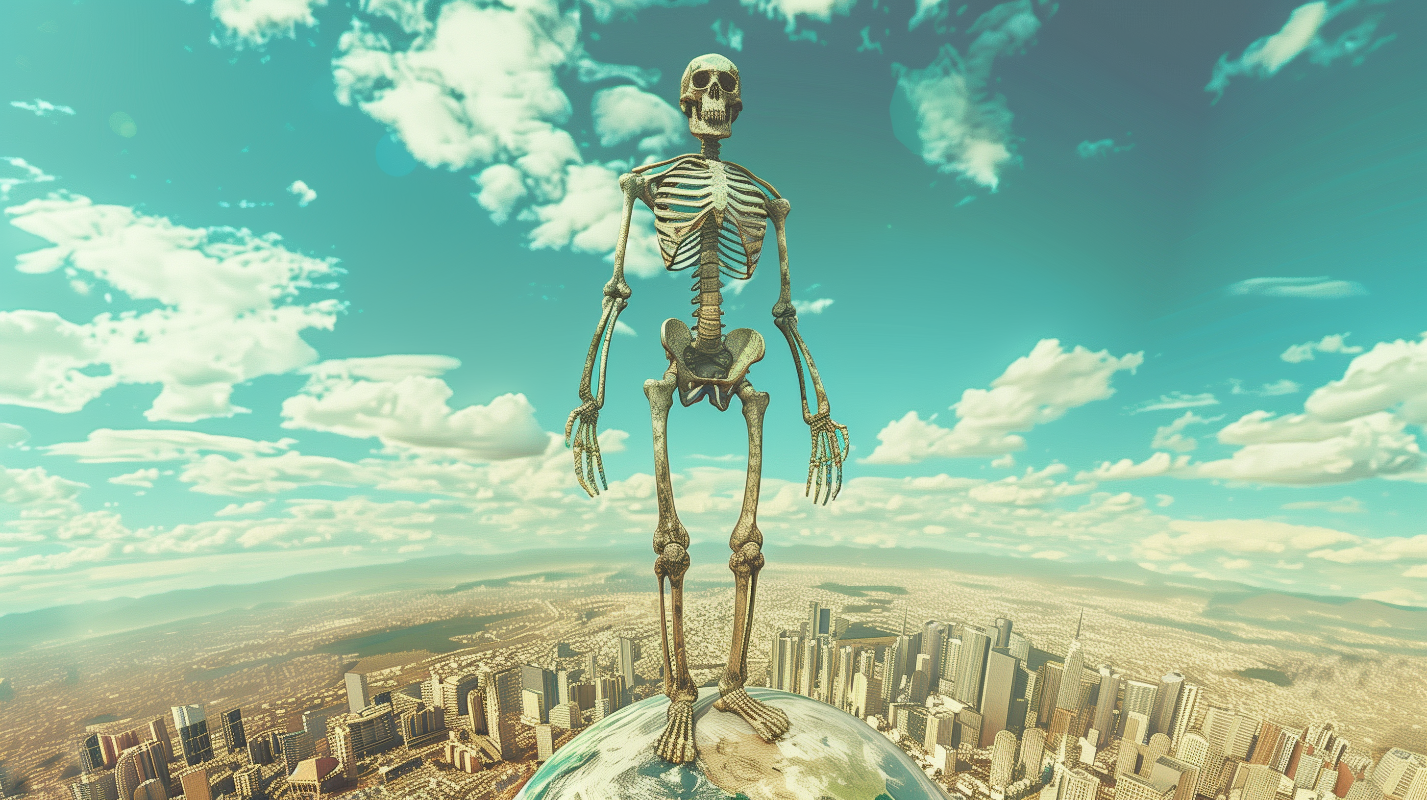 A colossal human skeleton towering 10,000 meters above the earth, surrounded by tiny buildings and people at its feet. The juxtaposition of the massive skeletal figure against the bustling cityscape below creates a surreal and awe-inspiring scene.
