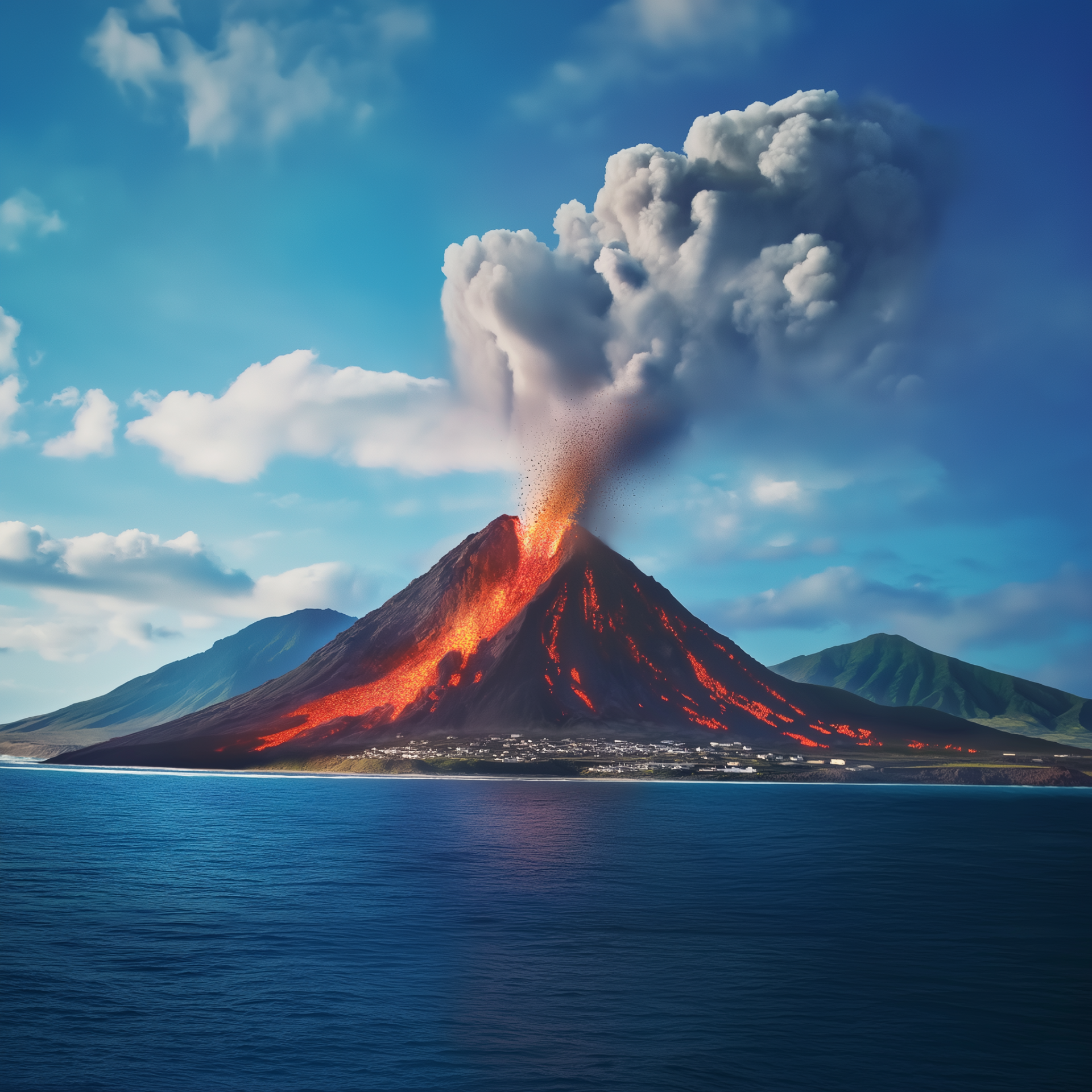 The image showcases a dramatic eruption of a seaside volcano, with large clouds of white smoke billowing into the sky. The contrast between the volcanic activity and the serene ocean backdrop creates a striking and powerful visual impact.