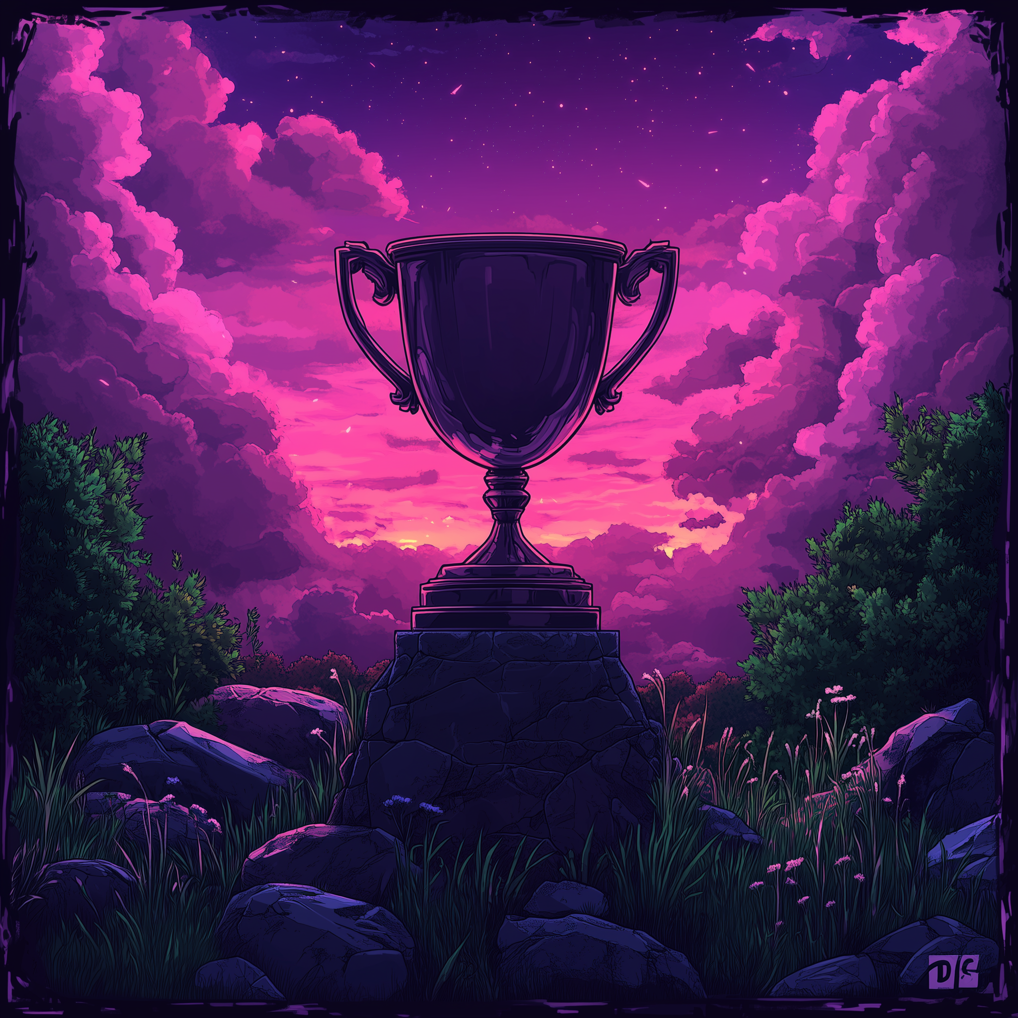 An epic and cinematic portrayal of a digital holograph trophy suspended in the vast midnight sky. The voxel graphics convey a dramatic and immersive wideshot perspective.