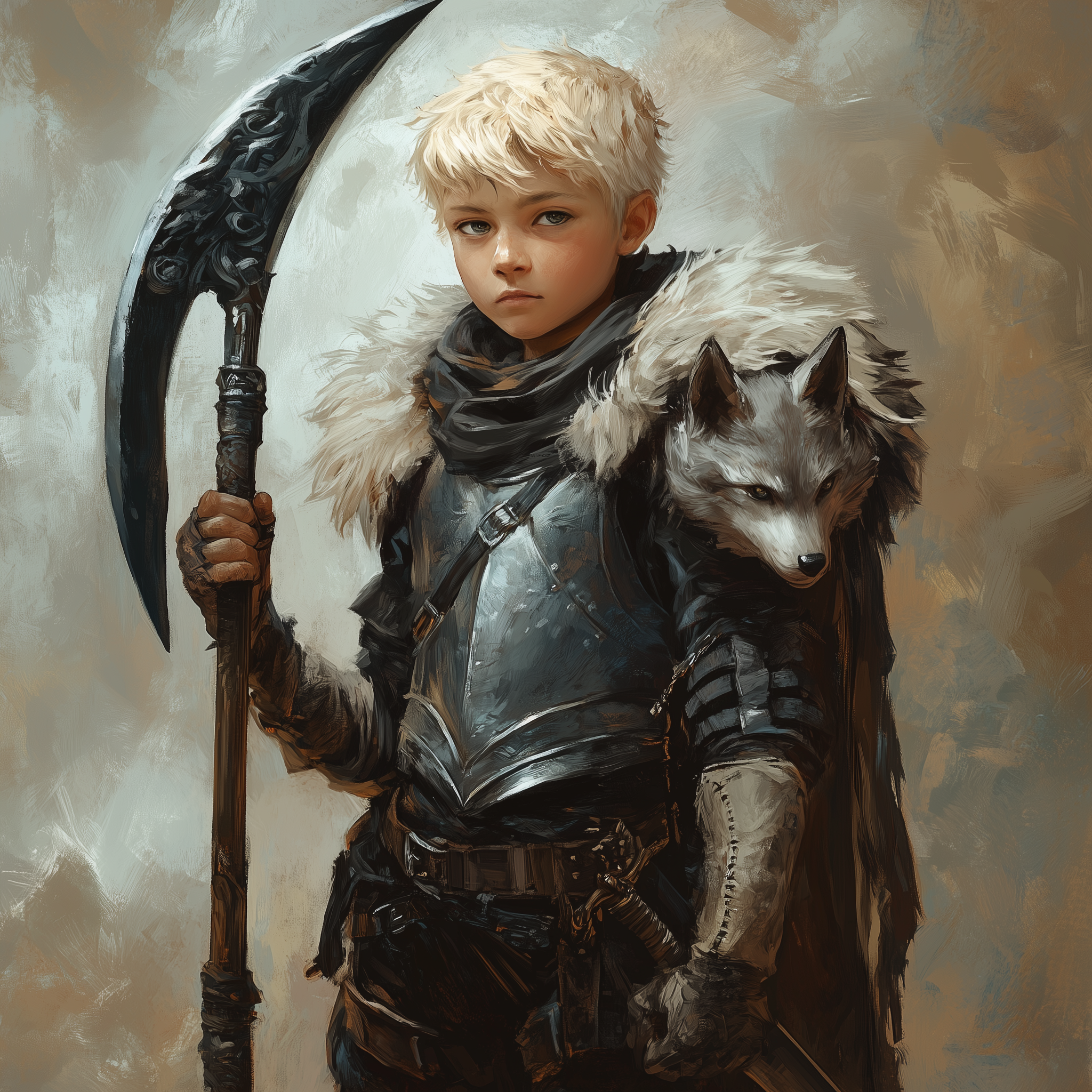 The image depicts a young boy wielding a scythe, exuding a fierce and adventurous spirit. His blonde hair contrasts with the detailed wolf shoulder pads of his armor, creating a striking and dynamic appearance.