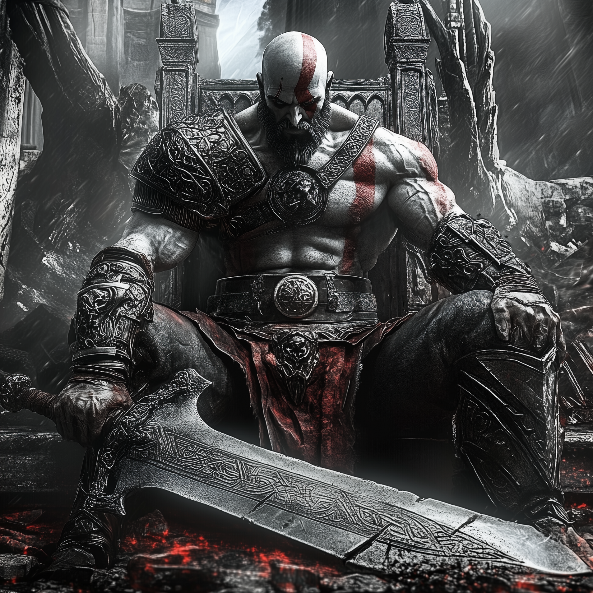 The image features a powerful figure resembling a god of war, exuding strength and ferocity. The character stands confidently with one hand on the hilt of a greatsword that's embedded in the ground, conveying a sense of readiness and authority.
